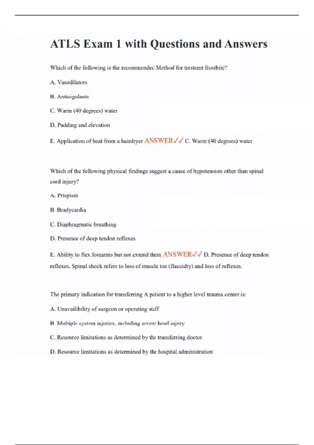 ATLS Exam 1 with Questions and Answers Which of the following is the recommended Method for trestemt frostbite? A. Vasodilators B. Anticigulants C. Warm (40 degrees) water D. Padding and elevation E. Application of heat from a hairdryer ANSWER C. Warm (40 degrees) water Which of the following physical findings suggest a cause of hypotension other than spinal cord injury? A. Prispism B. Bradycardia C. Diaphragmatic breathing D. Presence of deep tendon reflexes E. Ability to flex forearms but not extend them ANSWER D. Presence of deep tendon reflexes. Spinal shock refers to loss of muscle toe (flaccidty) and loss of reflexes. The primary indication for transferring A patient to a higher level trauma center is: A. Unavailibility of surgeon or operating staff B. Multiple system injuries, including severe head injury C. Resource limitations as determined by the transferring doctor D. Resource limitations as determined by the hospital administration