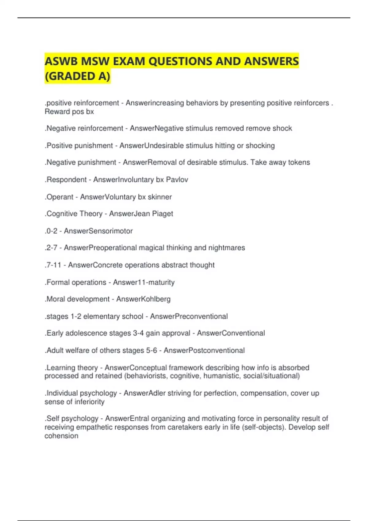 ASWB MSW EXAM QUESTIONS AND ANSWERS (GRADED A) .positive reinforcement - Answerincreasing behaviors by presenting positive reinforcers . Reward pos bx .Negative reinforcement - AnswerNegative stimulus removed remove shock .Positive punishment - AnswerUndesirable stimulus hitting or shocking .Negative punishment - AnswerRemoval of desirable stimulus. Take away tokens .Respondent - AnswerInvoluntary bx Pavlov .Operant - AnswerVoluntary bx skinner .Cognitive Theory - AnswerJean Piaget .0-2 - AnswerSensorimotor .2-7 - AnswerPreoperational magical thinking and nightmares .7-11 - AnswerConcrete operations abstract thought .Formal operations - Answer11-maturity .Moral development - AnswerKohlberg .stages 1-2 elementary school - AnswerPreconventional .Early adolescence stages 3-4 gain approval - AnswerConventional .Adult welfare of others stages 5-6 - AnswerPostconventional .Learning theory - AnswerConceptual framework describing how info is absorbed processed and retained (behaviorists, cognitive, humanistic, social/situational) .Individual psychology - AnswerAdler striving for perfection, compensation, cover up sense of inferiority .Self psychology - AnswerEntral organizing and motivating force in personality result of receiving empathetic responses from caretakers early in life (self-objects). Develop self cohension .Validates the child's sense of perfect self - AnswerMirroring self-psychology .Idealization - AnswerChild borows strngth from others and identifies eith someone more cspable self psy .Twinship/twinning - AnswerChild needs an alter ego for sense of belonging .Ego psychology - AnswerFocuses on rational conscious processes of the ego in the here and now. Behaves in situation, reality testing, coping and capacity fir relating to others .Psychosocial dev focuses on how children socialize - AnswerEric Erickson 8 stages .Trust v mistrust - AnswerBirth-one trust based on consistency of caregivers .Autonomy v shame-doubt - Answer1-3 assert independence .initiative v guilt - AnswerErik Erikson's social crisis stage 3, age 3-5. .Industry vs. Inferiority - Answer6-12 years sense of pride in accomplisments .identity vs. role confusion - AnswerErikson's stage during which teenagers and young adults search for and become their true selves .intimacy vs isolation - Answeryoung adulthood-willing to be open about self and commit to a close personal relationship .Generativity vs. Stagnation - AnswerMiddle Adulthood .ego integrity vs despair - Answerduring later life-has one led a satisfied life .object relations theory - AnswerMahler relationships with others strongly rooted in early attachments .Normal autism - Answer0-1 .Normal Symbiotic Phase - Answeruntil 5 mo. - aware of mother but not individualized - Mahler Sep. / Indivi. Theory .Separation/individuation phase - Answer5-9 mo .Practicing - Answer9-15 mo .Rapprochement - Answer15-24 mo physical mobility can dev fear of abondonment