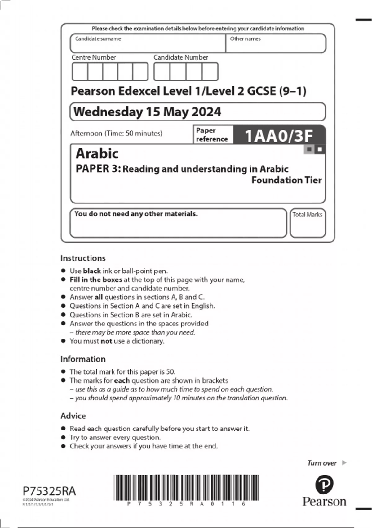 2024 Pearson Edexcel Level 1/Level 2 GCSE (9–1)Arabic PAPER 3: Reading and understanding in Arabic Foundation Tier QUESTION PAPER WITH FINAL MARKING SCHEME 100% VERIFIED