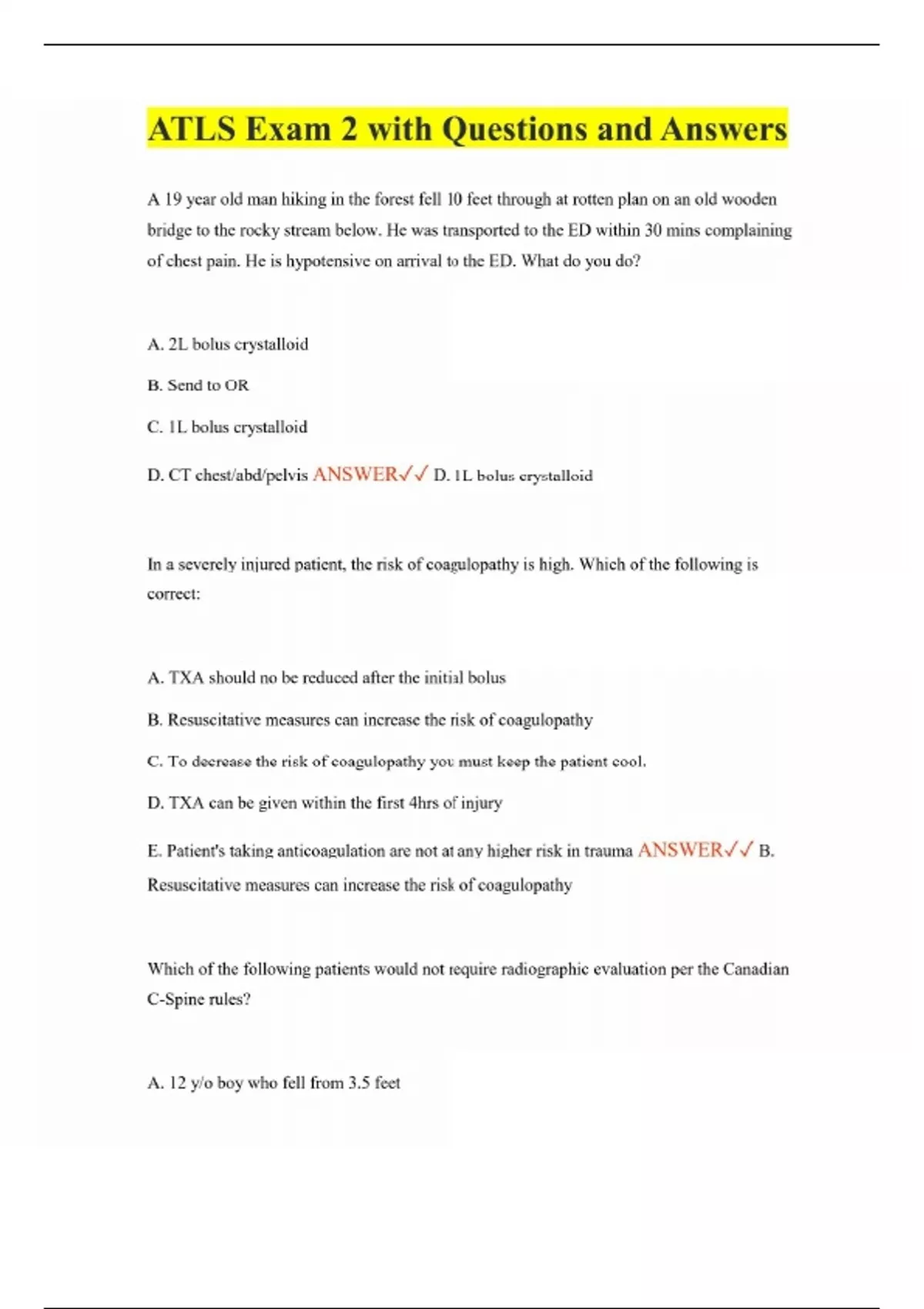 ATLS Exam 2 with Questions and Answers A 19 year old man hiking in the forest fell 10 feet through at rotten plan on an old wooden bridge to the rocky stream below. He was transported to the ED within 30 mins complaining of chest pain. He is hypotensive on arrival to the ED. What do you do? A. 2L bolus crystalloid B. Send to OR C. 1L bolus crystalloid D. CT chest/abd/pelvis ANSWER D. 1L bolus crystalloid In a severely injured patient, the risk of coagulopathy is high. Which of the following is correct: A. TXA should no be reduced after the initial bolus B. Resuscitative measures can increase the risk of coagulopathy C. To decrease the risk of coagulopathy you must keep the patient cool. D. TXA can be given within the first 4hrs of injury E. Patient's taking anticoagulation are not at any higher risk in trauma ANSWER B. Resuscitative measures can increase the risk of coagulopathy Which of the following patients would not require radiographic evaluation per the Canadian C-Spine rules? A. 12 y/o boy who fell from 3.5 feet B. 68 y/o man who was ambulatory at the scene C. 42 y/o women rear ended by a city bus D. 35 y/o woman with delayed onset of neck pain who can actively rotate her neck 45