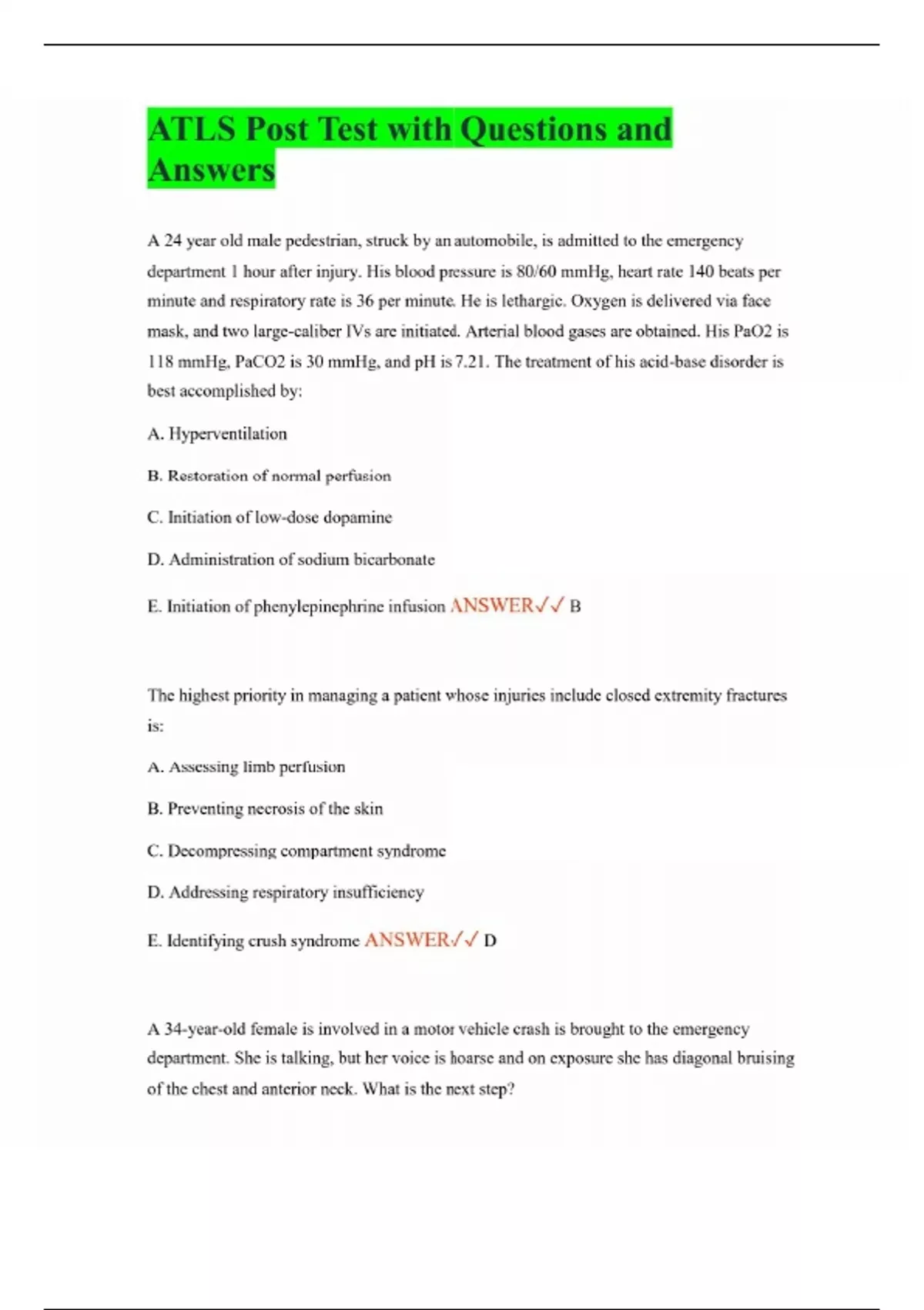 ATLS Post Test with Questions and Answers A 24 year old male pedestrian, struck by an automobile, is admitted to the emergency department 1 hour after injury. His blood pressure is 80/60 mmHg, heart rate 140 beats per minute and respiratory rate is 36 per minute. He is lethargic. Oxygen is delivered via face mask, and two large-caliber IVs are initiated. Arterial blood gases are obtained. His PaO2 is 118 mmHg, PaCO2 is 30 mmHg, and pH is 7.21. The treatment of his acid-base disorder is best accomplished by: A. Hyperventilation B. Restoration of normal perfusion C. Initiation of low-dose dopamine D. Administration of sodium bicarbonate E. Initiation of phenylepinephrine infusion ANSWER B The highest priority in managing a patient whose injuries include closed extremity fractures is: A. Assessing limb perfusion B. Preventing necrosis of the skin C. Decompressing compartment syndrome D. Addressing respiratory insufficiency E. Identifying crush syndrome ANSWER D A 34-year-old female is involved in a motor vehicle crash is brought to the emergency department. She is talking, but her voice is hoarse and on exposure she has diagonal bruising of the chest and anterior neck. What is the next step?