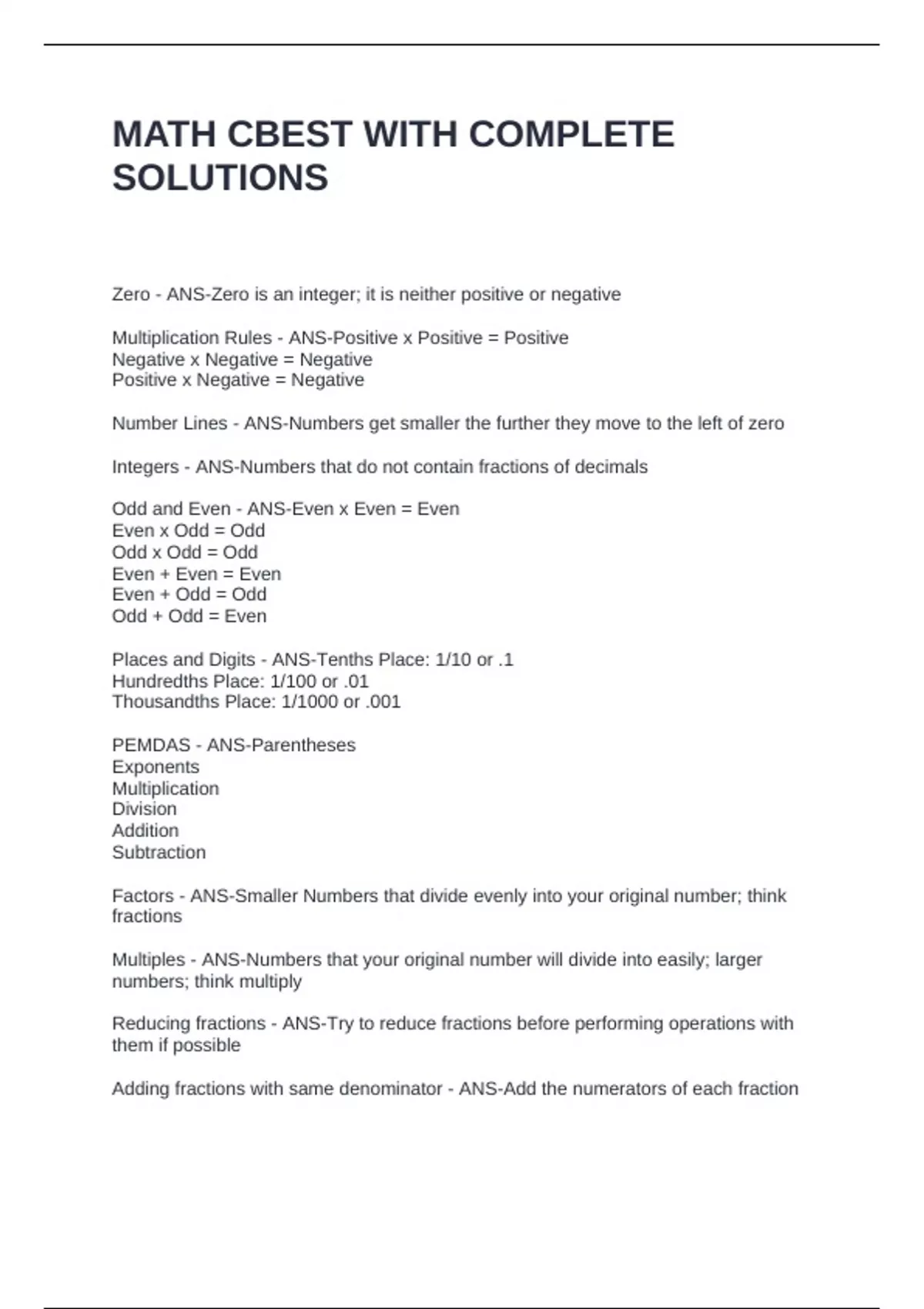 MATH CBEST WITH COMPLETE SOLUTIONS