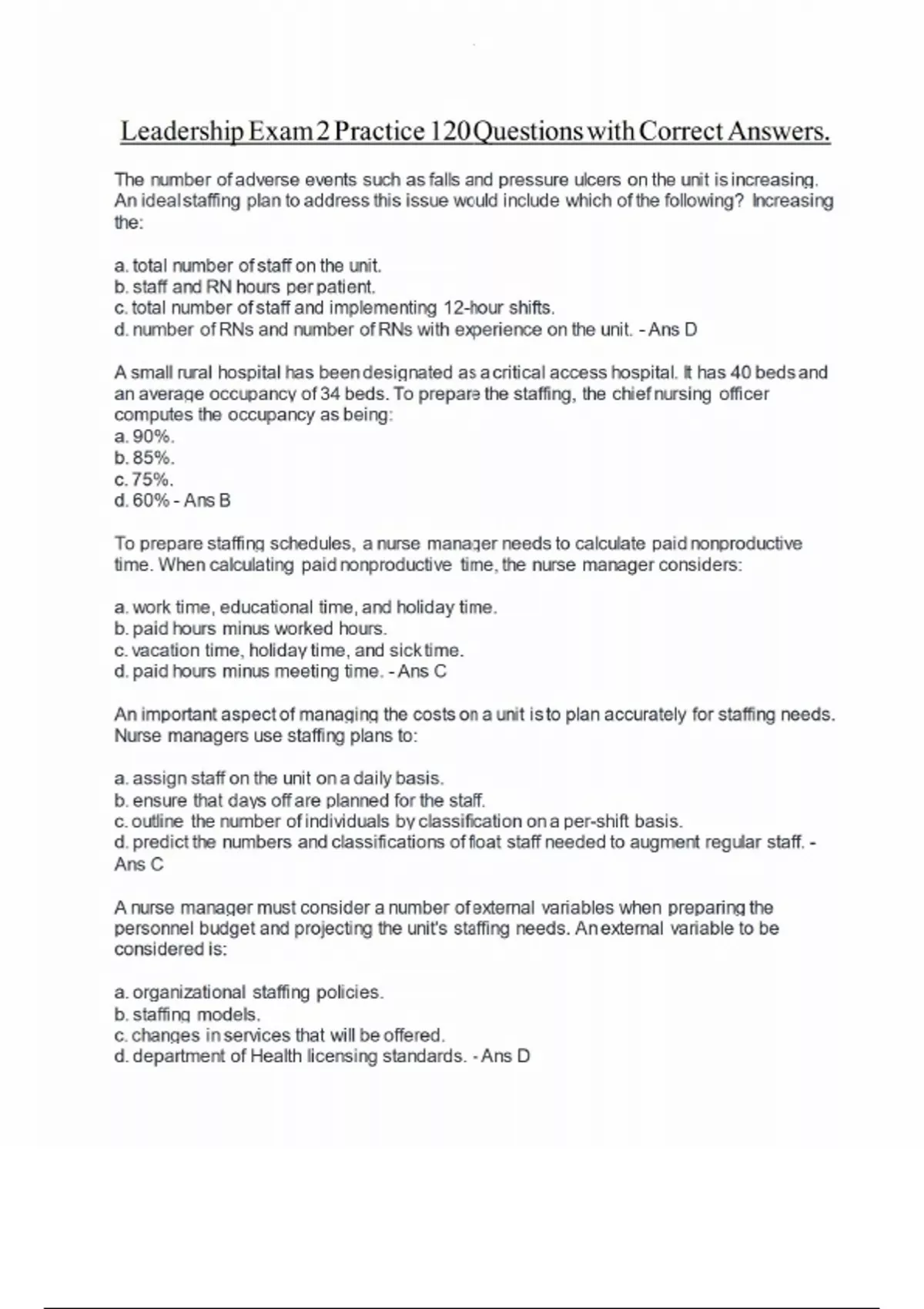 Leadership Exam 2 Practice 120 Questions with Correct Answers.