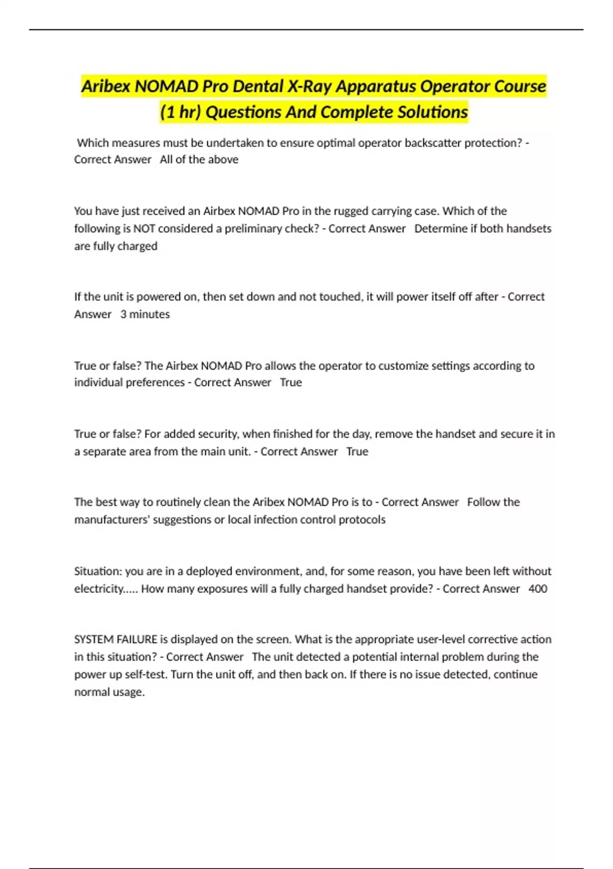 Aribex NOMAD Pro Dental X-Ray Apparatus Operator Course (1 hr) Questions And Complete Solutions