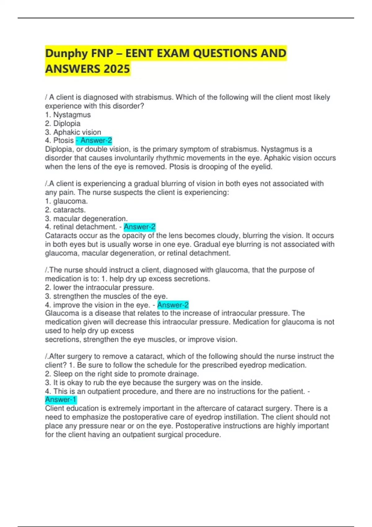 Dunphy FNP – EENT EXAM QUESTIONS AND ANSWERS 2025 / A client is diagnosed with strabismus. Which of the following will the client most likely experience with this disorder? 1. Nystagmus 2. Diplopia 3. Aphakic vision 4. Ptosis - Answer-2 Diplopia, or double vision, is the primary symptom of strabismus. Nystagmus is a disorder that causes involuntarily rhythmic movements in the eye. Aphakic vision occurs when the lens of the eye is removed. Ptosis is drooping of the eyelid. /.A client is experiencing a gradual blurring of vision in both eyes not associated with any pain. The nurse suspects the client is experiencing: 1. glaucoma. 2. cataracts. 3. macular degeneration. 4. retinal detachment. - Answer-2 Cataracts occur as the opacity of the lens becomes cloudy, blurring the vision. It occurs in both eyes but is usually worse in one eye. Gradual eye blurring is not associated with glaucoma, macular degeneration, or retinal detachment. /.The nurse should instruct a client, diagnosed with glaucoma, that the purpose of medication is to: 1. help dry up excess secretions. 2. lower the intraocular pressure. 3. strengthen the muscles of the eye. 4. improve the vision in the eye. - Answer-2 Glaucoma is a disease that relates to the increase of intraocular pressure. The medication given will decrease this intraocular pressure. Medication for glaucoma is not used to help dry up excess secretions, strengthen the eye muscles, or improve vision. /.After surgery to remove a cataract, which of the following should the nurse instruct the client? 1. Be sure to follow the schedule for the prescribed eyedrop medication. 2. Sleep on the right side to promote drainage. 3. It is okay to rub the eye because the surgery was on the inside. 4. This is an outpatient procedure, and there are no instructions for the patient. - Answer-1 Client education is extremely important in the aftercare of cataract surgery. There is a need to emphasize the postoperative care of eyedrop instillation. The client should not place any pressure near or on the eye. Postoperative instructions are highly important for the client having an outpatient surgical procedure. /.A tonometry test has been performed with a client and the results are 25 mmHg. The nurse know that: 1. the reading is low and there is no problem. 2. the reading is normal and nothing needs to be done at this time. 3. the results are high and follow-up readings and tests are needed. 4. the results are high and there is no cure to bring the pressure down. - Answer-3 Several reading need to be taken throughout the day to establish the highest reading to be the treated pressure. Normal intraocular pressure ranges from 12 to 16 mmHg. The reading of 25 mmHg is not low or normal. Medication can be prescribed to reduce the pressure. /.A client has been diagnosed with cataracts. The nurse realizes that the only treatment for this disorder is? 1. Medical management with eyedrops 2. Surgical removal of the lens 3. Cryopexy 4. Phototherapy - Answer-2 Surgical treatment for cataracts begins when vision is sufficiently impaired. The lens is removed and the replacement artificial intraocular lens is put in place. Cataracts cannot be treated with medication alone. Cryopexy and phototherapy are not used to treat cataracts. /.Which of the following should the nurse assess in a client diagnosed with open-angle glaucoma? 1. Degree of lost vision 2. Severity of headaches 3. Amount of blurred vision 4. Date of onset - Answer-1 Open-angle glaucoma is characterized by a gradual increase in pressure and a gradual loss of vision. Closed-angle glaucoma presents with a sudden onset causing headache, blurred vision, and eye pain. /.A client is experiencing little flashes of lights and things floating in the visual field. The nurse suspects: 1. cataracts. 2. glaucoma. 3. conjunctivitis. 4. retinal detachment. - Answer-4 Retinal detachment is clinically manifested by flashes and floaters in the visual field. Flashes of light and floaters are not associated with cataracts, glaucoma, or conjunctivitis. /.A client tells the nurse that she sees a shadow that is slowing getting worse in her left eye. Which of the following should the nurse do? 1. Instruct the client to return home to rest in bed. 2. Encourage the client to continue with normal daily activities. 3. Notify an ophthalmologist. 4. Encourage fluids and normal saline eyedrops. - Answer-3 The nurse should notify an ophthalmologist with the clients symptoms. The onset of a shadow in the field of vision that will not dissipate is an indication of a detached retina. Retinal detachments rarely self-repair, and the client will need surgery. The nurse should not instruct the client to return home to rest in bed. The client should not be encouraged to continue with normal daily activities. Fluids and saline eyedrops will not help a detached retina. /.A client is experiencing a loss of central vision but not a loss of peripheral vision. The nurse realizes the client should be evaluated for: 1. detached retina syndrome. 2. nystagmus. 3. macular degeneration. 4. conjunctivitis. - Answer-3 Macular degeneration is a deterioration of part of the retina, causing loss of central vision but not affecting peripheral vision. The loss of central vision is not typically seen in a detached retina, nystagmus, or conjunctivitis. /.A client is experiencing redness, burning, itching, and pain of the eyes. The nurse suspects the client is experiencing: 1. blepharitis. 2. conjunctivitis. 3. keratitis. 4. iritis. - Answer-2 Clinical manifestations of conjunctivitis (pink eye) include watery eyes, redness, itching, and burning pain. Blepharitis is associated with a sticky exudate. Keratitis is associated with photophobia. Iritis is associated with blurred vision and photophobia. /.A client has been diagnosed as being legally blind. The nurse realizes this clients vision is: 1. 20/200 or less in the better eye with correction. 2. 20/200 or less in the worse eye without correc