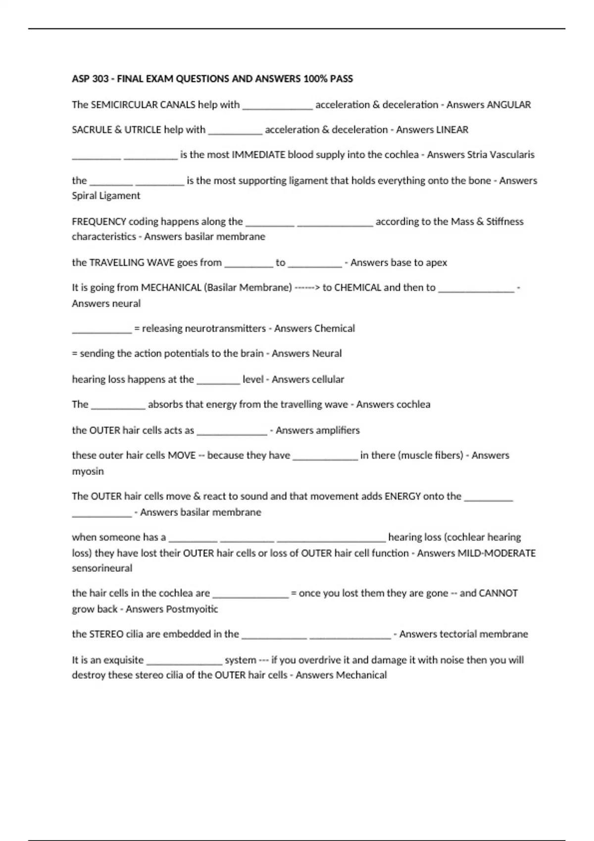 ASP 303 - FINAL EXAM QUESTIONS AND ANSWERS 100% PASS The SEMICIRCULAR CANALS help with _____________ acceleration & deceleration - Answers ANGULAR SACRULE & UTRICLE help with __________ acceleration & deceleration - Answers LINEAR _________ __________ is the most IMMEDIATE blood supply into the cochlea - Answers Stria Vascularis the ________ _________ is the most supporting ligament that holds everything onto the bone - Answers Spiral Ligament FREQUENCY coding happens along the _________ ______________ according to the Mass & Stiffness characteristics - Answers basilar membrane the TRAVELLING WAVE goes from _________ to __________ - Answers base to apex It is going from MECHANICAL (Basilar Membrane) ------> to CHEMICAL and then to ______________ - Answers neural ___________ = releasing neurotransmitters - Answers Chemical = sending the action potentials to the brain - Answers Neural hearing loss happens at the ________ level - Answers cellular The __________ absorbs that energy from the travelling wave - Answers cochlea the OUTER hair cells acts as _____________ - Answers amplifiers these outer hair cells MOVE -- because they have ____________ in there (muscle fibers) - Answers myosin The OUTER hair cells move & react to sound and that movement adds ENERGY onto the _________ ___________ - Answers basilar membrane when someone has a _________ __________ ____________________ hearing loss (cochlear hearing loss) they have lost their OUTER hair cells or loss of OUTER hair cell function - Answers MILD-MODERATE sensorineural the hair cells in the cochlea are ______________ = once you lost them they are gone -- and CANNOT grow back - Answers Postmyoitic the STEREO cilia are embedded in the ____________ _______________ - Answers tectorial membrane It is an exquisite ______________ system --- if you overdrive it and damage it with noise then you will destroy these stereo cilia of the OUTER hair cells - Answers Mechanical if you have a __________ __________ -- you will have to add more energy in there before you are able to hear anything - Answers hearing loss the INNER hair cells are _______________ - Answers TRANSDUCERS the Inner hair cells are responsible for ______________ & _______________ - Answers sensitivity & selectivity The INNER hair cells are TRANSDUCERS by a _____________ synapse - Answers Chemical Inside the cell it is going to be _______________ - Answers negative and when you have a positively charged ion that rushes into the cell then you have ____________ - Answers depolarization after this influx and de-polarization -- the positive charge is going to cause the hair cells to release a _____________________ -- glutamate - Answers neurotransmitter the neurotransmitter going into the synaptic cleft and attaches to the _____________ fiber - Answers afferent in the axon you are going to have a firing of the __________ ___________ - Answers action potential If you have more SEVERE hearing losses - it is going to involve ___________ hair cells - Answers inner {in the INNER EAR} there is a BONY LABYRINTH, made of canals in the __________ ___________ - Answers temporal bone INSIDE the BONY LABYRINTH - suspended in PERILYMPH - is the ___________ ____________ - Answers membranous labyrinth what is the MEMBRANOUS LABYRINTH suspended in? - Answers perilymph what are the 3 parts of the inner ear? - Answers 1. vestibule 2. semicircular canals 3. cochlea what does the UTRICLE contain? - Answers Macula and what is the UTRICLE responsible for? - Answers LINEAR acceleration & deceleration Anatomically the reason they are responsible for this because of the _____________ - Answers Macula These____________ (which are in the Macula) are embedded in jello ( a gelatinous mass) - Answers Otoconia