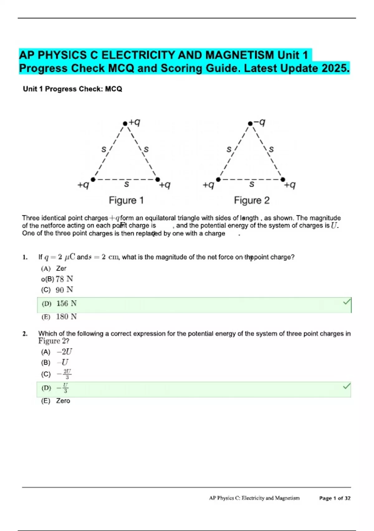 AP PHYSICS C ELECTRICITY AND MAGNETISM Unit 1 Progress Check MCQ and Scoring Guide. Latest Update 2025.
