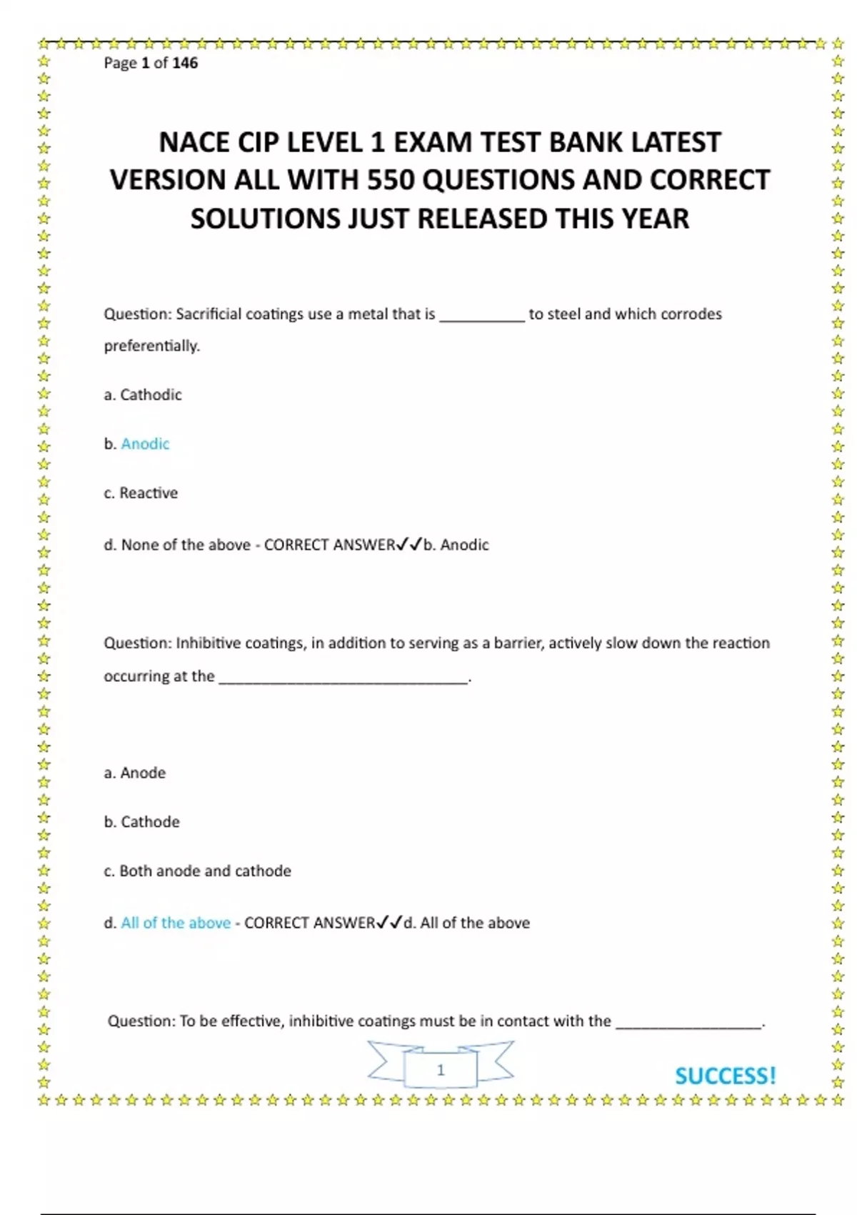 NACE CIP LEVEL 1 EXAM TEST BANK LATEST VERSION ALL WITH 550 QUESTIONS AND CORRECT SOLUTIONS JUST RELEASED THIS YEAR