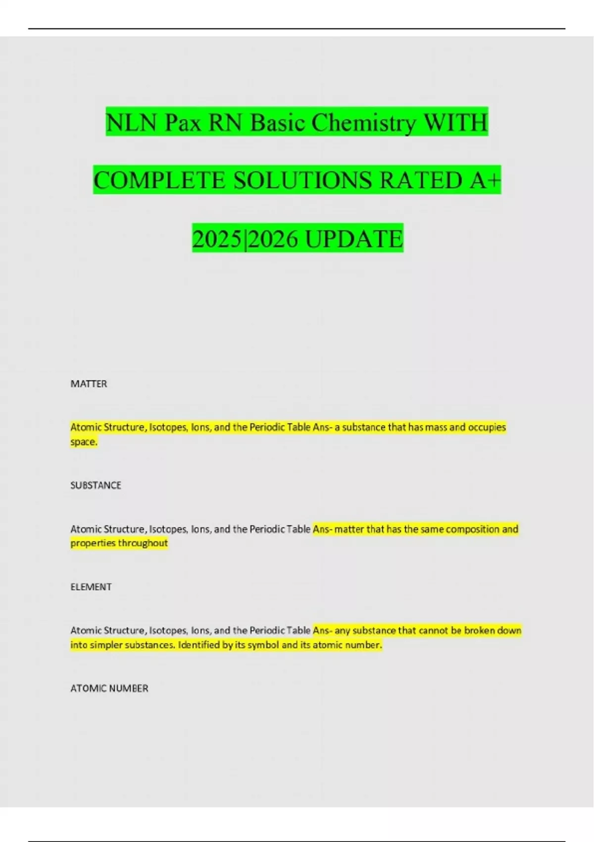 NLN Pax RN Basic Chemistry WITH COMPLETE SOLUTIONS RATED A+ 2025|2026 UPDATE MATTER Atomic Structure, Isotopes, Ions, and the Periodic Table Ans- a substance that has mass and occupies space. SUBSTANCE Atomic Structure, Isotopes, Ions, and the Periodic Table Ans- matter that has the same composition and properties throughout ELEMENT Atomic Structure, Isotopes, Ions, and the Periodic Table Ans- any substance that cannot be broken down into simpler substances. Identified by its symbol and its atomic number. ATOMIC NUMBERAtomic Structure, Isotopes, Ions, and the Periodic Table Ans- is equal to the number of protons found in the nucleus. MASS NUMBER Atomic Structure, Isotopes, Ions, and the Periodic Table Ans- number of protons and neutrons (nucleons) in the nucleus of an atom ISOTOPE Atomic Structure, Isotopes, Ions, and the Periodic Table Ans- atoms of the same element with the same atomic number but with different numbers of neutrons ATOMIC MASS Atomic Structure, Isotopes, Ions, and the Periodic Table Ans- The atomic mass may be considered to be the total mass of protons, neutrons and electrons in a single atom. ION Atomic Structure, Isotopes, Ions, and the Periodic Table Ans- atom that has a positive or negative charge ATOM Atomic Structure, Isotopes, Ions, and the Periodic Table Ans- smallest unit of an element that still retains the properties of that element consists of thre subatomic particles. PROTON Atomic Structure, Isotopes, Ions, and the Periodic Table Ans- a subatomic particle that has a positive charge and that is found in the nucleus of an atom
