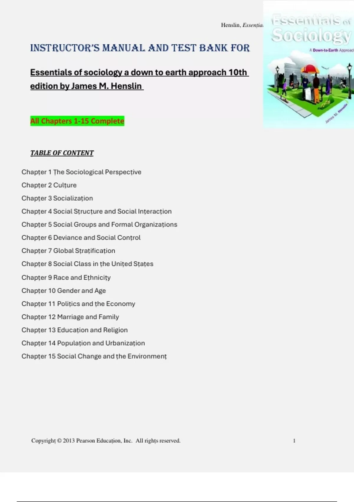 InsTrucTor’s Manual and TesT Bank for Essentials of sociology a down to earth approach 10th edition by James M. Henslin All Chapters 1-15 Complete