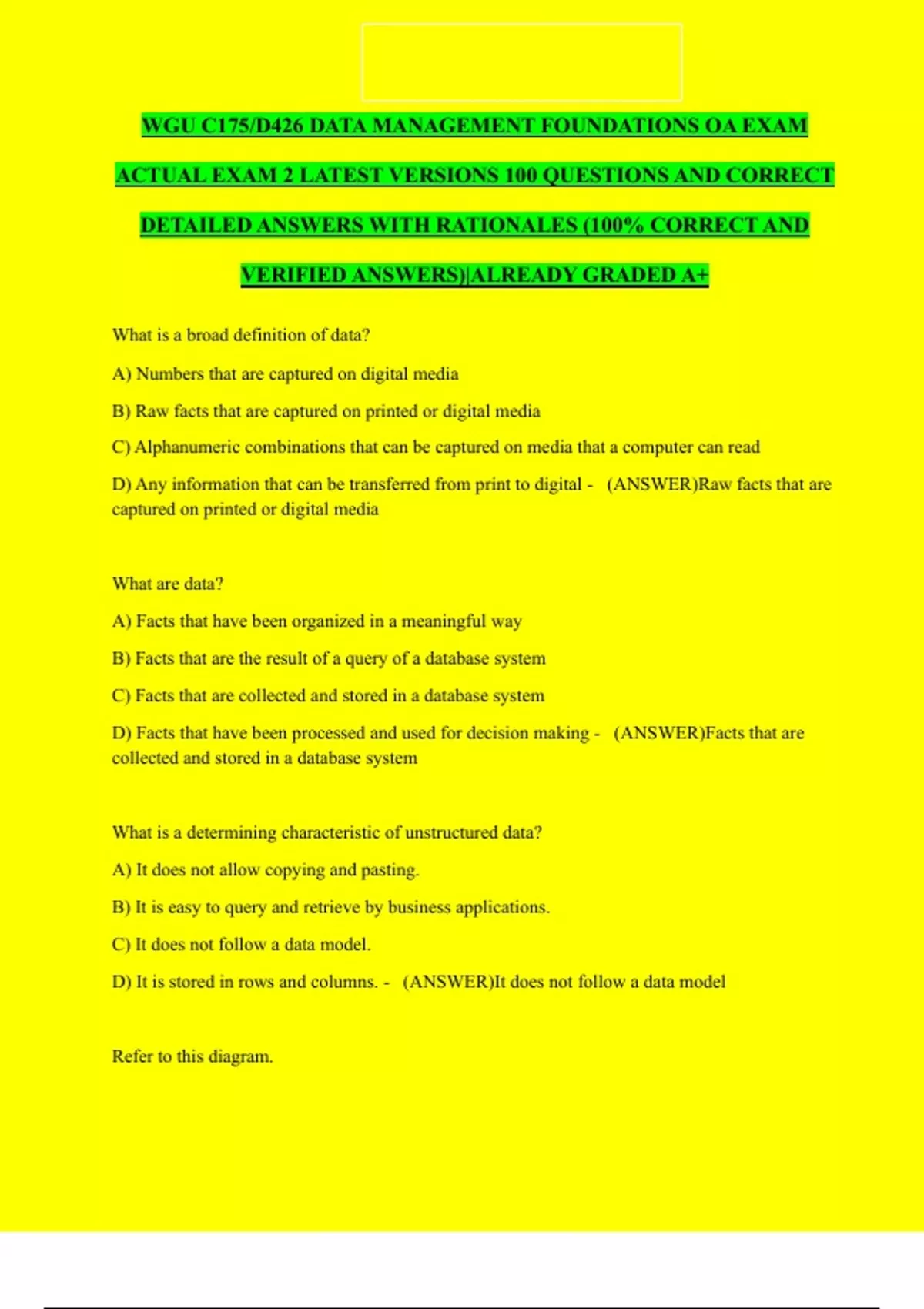 WGU C175/D426 DATA MANAGEMENT FOUNDATIONS OA EXAM ACTUAL EXAM 2 LATEST VERSIONS 100 QUESTIONS AND CORRECT DETAILED ANSWERS WITH RATIONALES (100% CORRECT AND VERIFIED ANSWERS)|ALREADY GRADED A+