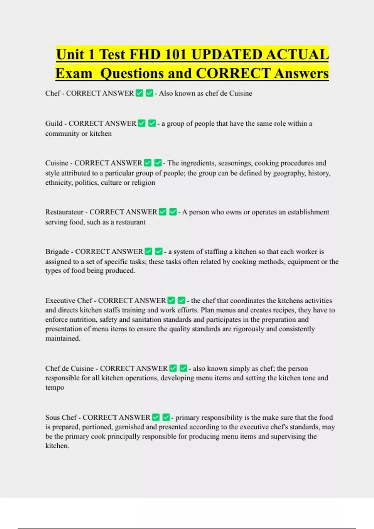 Unit 1 Test FHD 101 UPDATED ACTUAL Exam Questions and CORRECT Answers Chef - CORRECT ANSWER Guild - CORRECT ANSWER community or kitchen Cuisine - CORRECT ANSWER - Also known as chef de Cuisine - a group of people that have the same role within a - The ingredients, seasonings, cooking procedures and style attributed to a particular group of people; the group can be defined by geography, history, ethnicity, politics, culture or religion