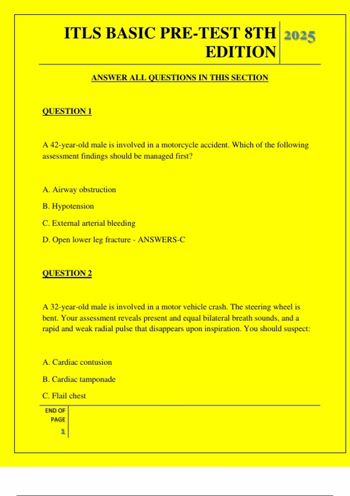 ITLS BASIC PRE-TEST 8TH EDITION QUESTIONS AND ANSWERS 2025