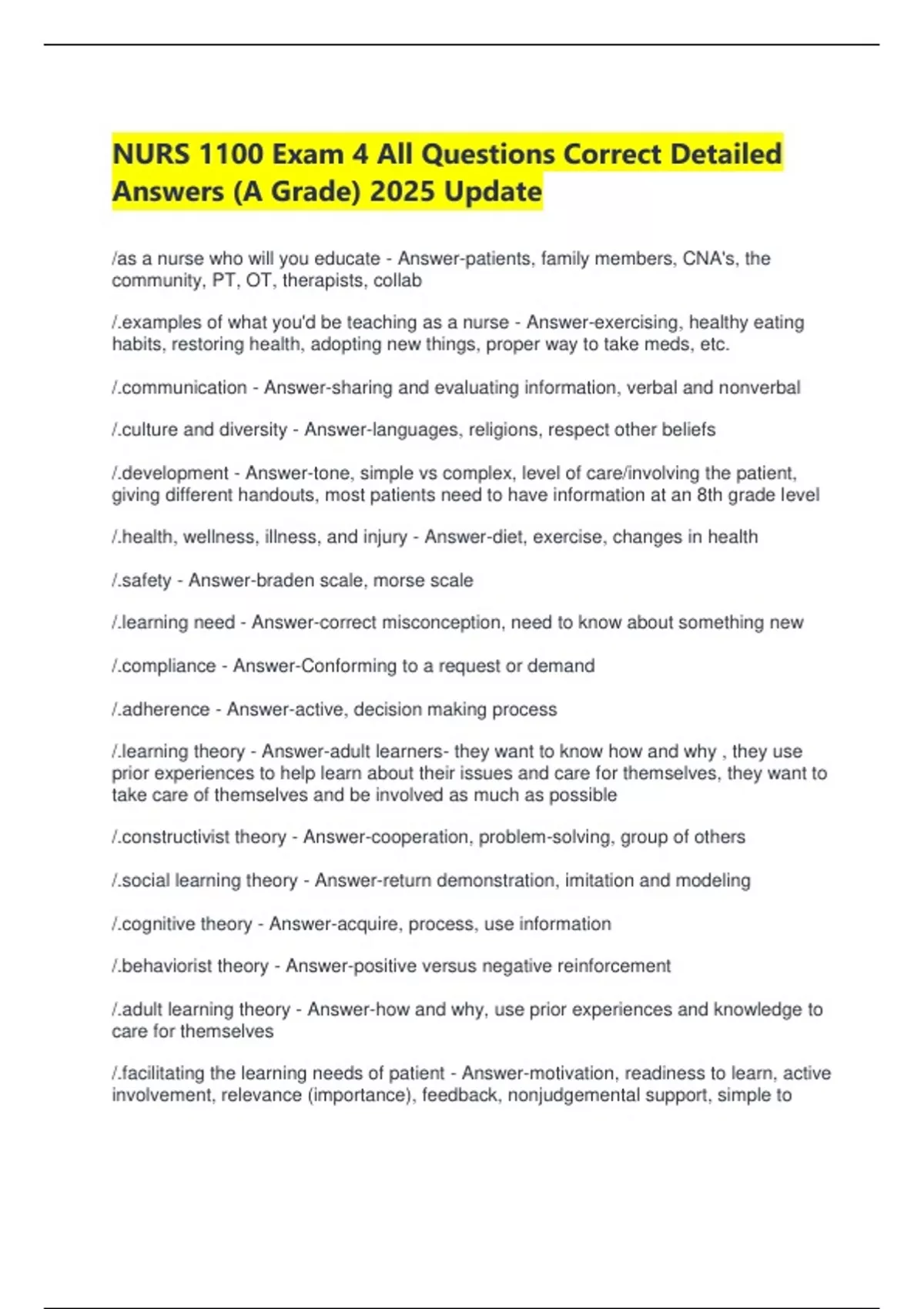 NURS 1100 Exam 4 All Questions Correct Detailed Answers (A Grade) 2025 Update /as a nurse who will you educate - Answer-patients, family members, CNA's, the community, PT, OT, therapists, collab /.examples of what you'd be teaching as a nurse - Answer-exercising, healthy eating habits, restoring health, adopting new things, proper way to take meds, etc. /.communication - Answer-sharing and evaluating information, verbal and nonverbal /.culture and diversity - Answer-languages, religions, respect other beliefs /.development - Answer-tone, simple vs complex, level of care/involving the patient, giving different handouts, most patients need to have information at an 8th grade level /.health, wellness, illness, and injury - Answer-diet, exercise, changes in health /.safety - Answer-braden scale, morse scale /.learning need - Answer-correct misconception, need to know about something new /.compliance - Answer-Conforming to a request or demand /.adherence - Answer-active, decision making process /.learning theory - Answer-adult learners- they want to know how and why , they use prior experiences to help learn about their issues and care for themselves, they want to take care of themselves and be involved as much as possible /.constructivist theory - Answer-cooperation, problem-solving, group of others /.social learning theory - Answer-return demonstration, imitation and modeling /.cognitive theory - Answer-acquire, process, use information /.behaviorist theory - Answer-positive versus negative reinforcement /.adult learning theory - Answer-how and why, use prior experiences and knowledge to care for themselves /.facilitating the learning needs of patient - Answer-motivation, readiness to learn, active involvement, relevance (importance), feedback, nonjudgemental support, simple to complex (understand basics first), repetition (repeating information, figure out a different way to say things, why are you having to repeat yourself), timing, environment /.barriers to learning - Answer-acute illness, pain, prognosis, biorhythms, emotions, language, older adults, children, culture/religion, physical disability, mental disability /.lifespan considerations- developing teaching plans - Answer-children- they may be scared, involve caregivers, play/praise adolescents- independence, but they can be forgetful, helping them understand the importance of being independent adults- chronic diseases, health promotion, why and how, time for questions older adults- health declination changes, follow-ups, involve other family members, 6th grade level hand outs/large print patients with special needs- living environment, involve caregiver /.use of technology - Answer-E-health movement: focuses on making healthcare resources more accessible by transferring them to electronic media, includes technology-based tools that offer nurses innovative methods for working with patients 72% of US adults seek health information online: published articles, clinical studies, scholarly journal publications, also unreliable, questionable, biased sources, providers must review sources carefully to identify reliable ones, also teach patients how to distinguish trustworthy from false, potentially dangerous health advice /.patient consumer education - Answer-what are the needs? what is the environment? what are the specifics? (what is most important today, address primary concern, teach back and return demonstration /.grief and loss - Answer-grief- the physical, psychological, biological, and behavioral response to a loss loss-occurs when something we value is no longer available or drastically changed. loss of friendship, loss of independence /.types of loss - Answer-the source of loss has a great impact actual loss- identified and recognized by others (when it actually happens) anticipatory loss- a loss is coming (deployment, hospice)