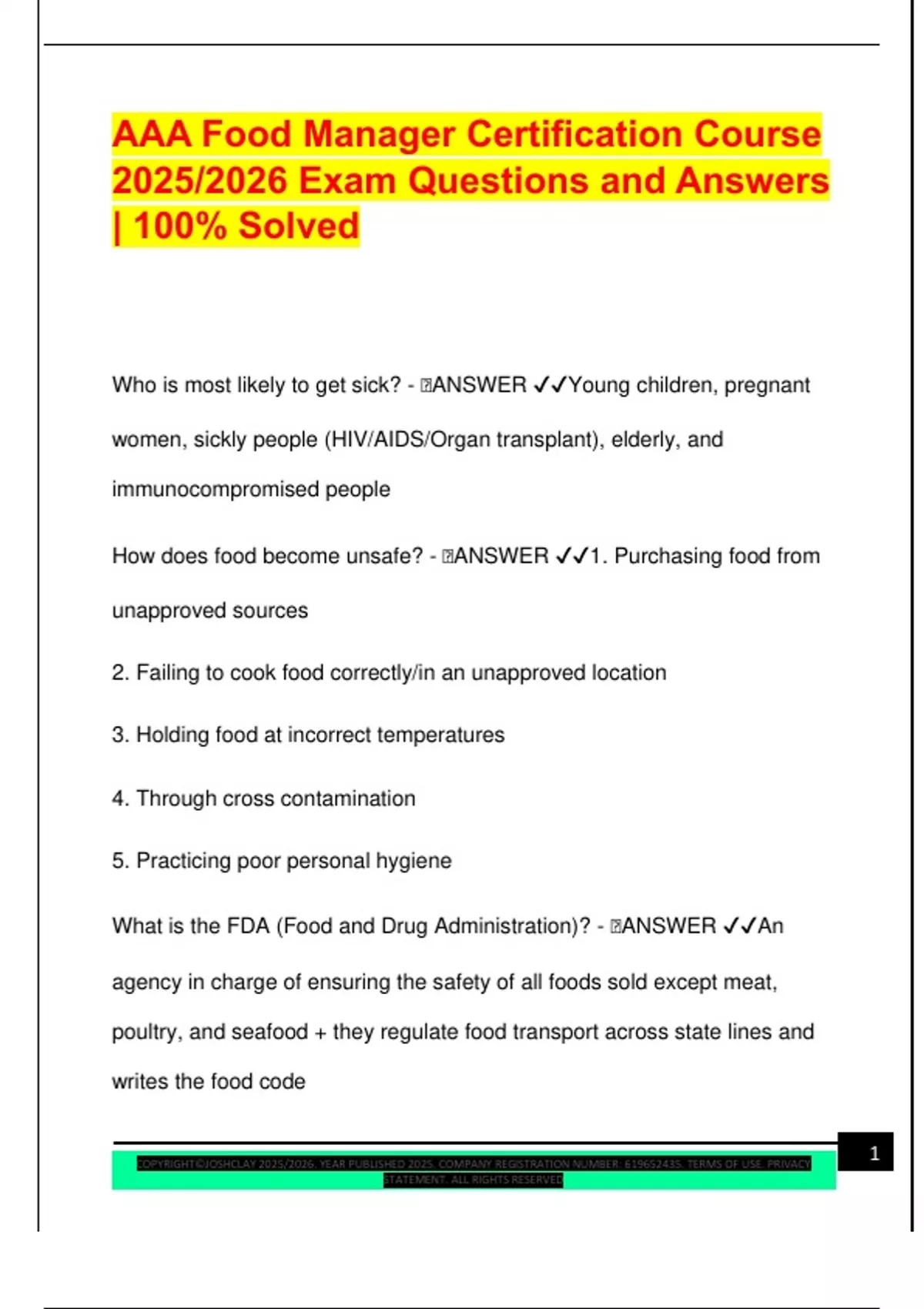 AAA Food Manager Certification Course 2025/2026 Exam Questions and Answers | 100% Solved