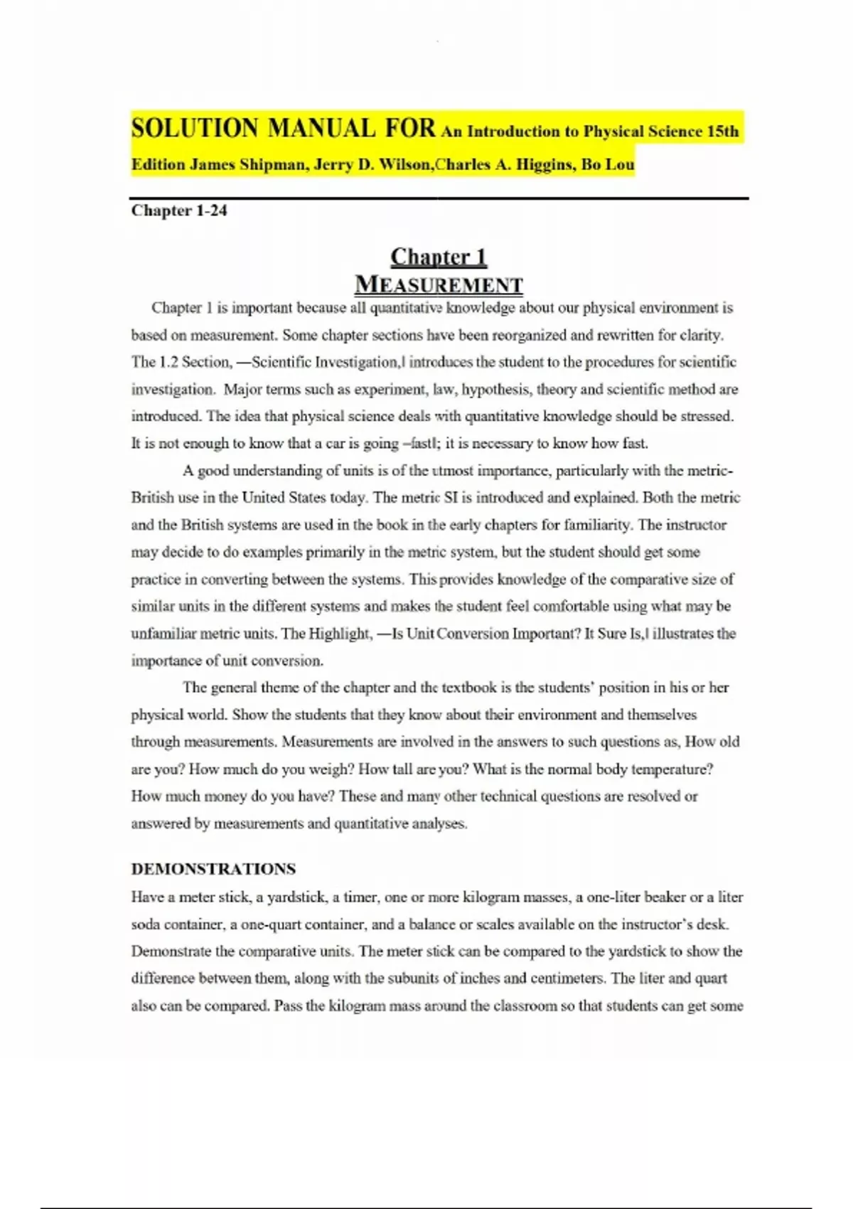SOLUTION MANUAL FOR An Introduction to Physical Science 15th Edition James Shipman, Jerry D. Wilson, Charles A. Higgins, Bo Lou-Chapter 1 is important because all quantitative knowledge about our physical environment is based on measurement. Some chapter sections have been reorganized and rewritten for clarity. The 1.2 Section, ―Scientific Investigation,‖ introducesthe student to the procedures for scientific investigation. Major terms such as experiment, law, hypothesis, theory and scientific method are introduced. The idea that physical science deals with quantitative knowledge should be stressed. It is not enough to know that a car is going ―fast‖; it is necessary to know how fast. A good understanding of units is of the utmost importance, particularly with the metricBritish use in the United States today. The metric SI is introduced and explained. Both the metric and the British systems are used in the book in the early chapters for familiarity. The instructor may decide to do examples primarily in the metric system, but the student should get some practice in converting between the systems. This provides knowledge of the comparative size of similar units in the different systems and makes the student feel comfortable using what may be unfamiliar metric units. The Highlight, ―Is Unit Conversion Important? It Sure Is,‖ illustrates the importance of unit conversion. The general theme of the chapter and the textbook is the students’ position in his or her physical world. Show the students that they know about their environment and themselves through measurements. Measurements are involved in the answers to such questions as, How old are you? How much do you weigh? How tall are you? What is the normal body temperature? How much money do you have? These and many other technical questions are resolved or answered by measurements and quantitative analyses. DEMONSTRATIONS Have a meter stick, a yardstick, a timer, one or more kilogram masses, a one-liter beaker or a liter soda container, a one-quart container, and a balance or scales available on the instructor’s desk. Demonstrate the comparative units. The meter stick can be compared to the yardstick to show the difference between them, along with the subunits of inches and centimeters. The liter and quart also can be compared. Pass the kilogram mass around the classroom so that students can get some idea of the amount of mass in one kilogram. Mass and weight may be compared on the balance and scales. When discussing Section 1.6, ―Derived Units and Conversion Factors,‖ have class members guess the length of the instructor’s desk in metric and British units. Then have several students independently measure the length with the meter stick and yardstick. Compare the measurements in terms of significant figures and units. Compare the averages of the measurements and estimates. Convert the average metric measurement to British units, and vice versa, to practice conversion factors and to see how the measurements compare. Various metric unit demonstrations are available from commercial sources.