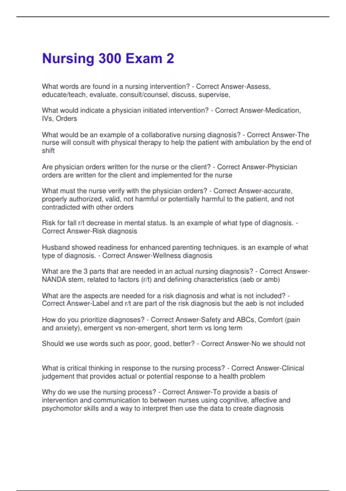 What words are found in a nursing intervention? - Correct Answer-Assess, educate/teach, evaluate, consult/counsel, discuss, supervise, What would indicate a physician initiated intervention? - Correct Answer-Medication, IVs, Orders What would be an example of a collaborative nursing diagnosis? - Correct Answer-The nurse will consult with physical therapy to help the patient with ambulation by the end of shift Are physician orders written for the nurse or the client? - Correct Answer-Physician orders are written for the client and implemented for the nurse What must the nurse verify with the physician orders? - Correct Answer-accurate, properly authorized, valid, not harmful or potentially harmful to the patient, and not contradicted with other orders Risk for fall r/t decrease in mental status. Is an example of what type of diagnosis. - Correct Answer-Risk diagnosis Husband showed readiness for enhanced parenting techniques. is an example of what type of diagnosis. - Correct Answer-Wellness diagnosis What are the 3 parts that are needed in an actual nursing diagnosis? - Correct AnswerNANDA stem, related to factors (r/t) and defining characteristics (aeb or amb)
