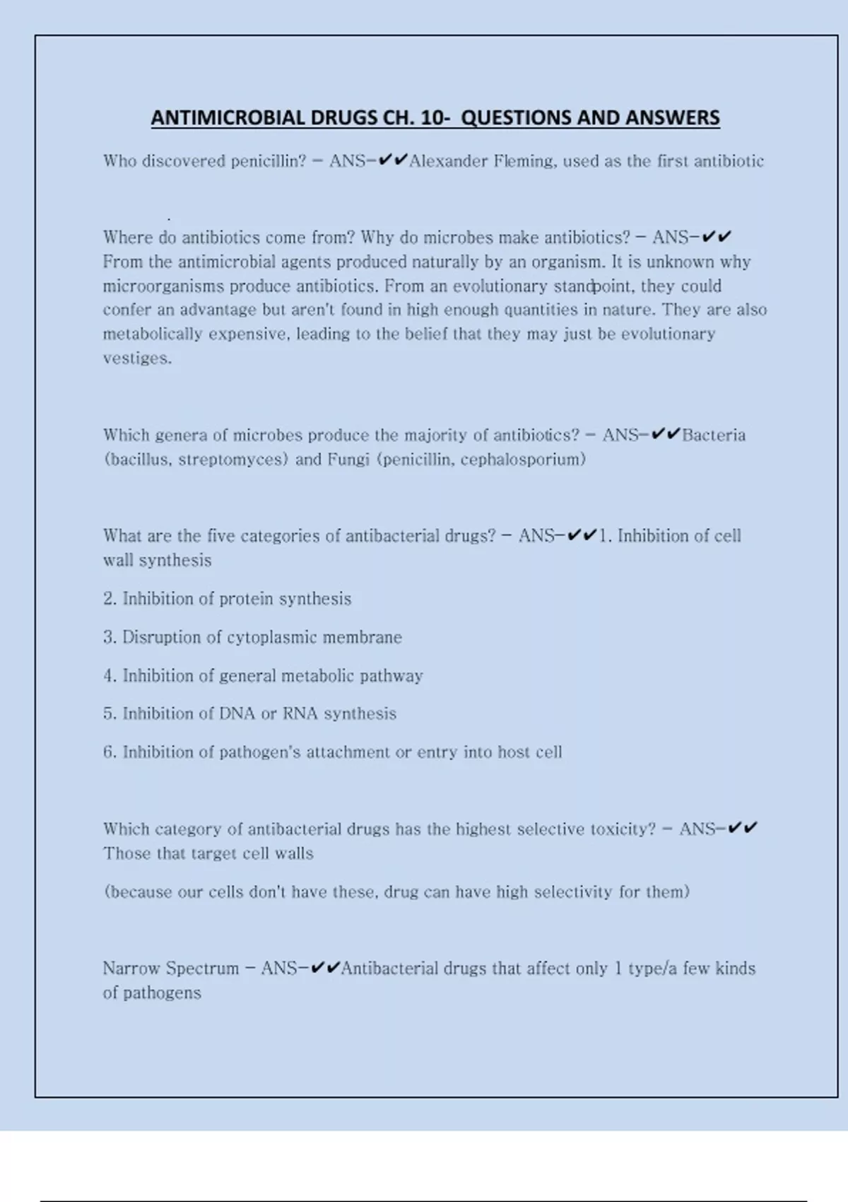 ANTIMICROBIAL DRUGS CH. 10- QUESTIONS AND ANSWERS Who discovered penicillin? - ANS-Alexander Fleming, used as the first antibiotic Where do antibiotics come from? Why do microbes make antibiotics? - ANS-From the antimicrobial agents produced naturally by an organism. It is unknown why microorganisms produce antibiotics. From an evolutionary standpoint, they could confer an advantage but aren't found in high enough quantities in nature. They are also metabolically expensive, leading to the belief that they may just be evolutionary vestiges. Which genera of microbes produce the majority of antibiotics? - ANS-Bacteria (bacillus, streptomyces) and Fungi (penicillin, cephalosporium) What are the five categories of antibacterial drugs? - ANS-1. Inhibition of cell wall synthesis 2. Inhibition of protein synthesis 3. Disruption of cytoplasmic membrane 4. Inhibition of general metabolic pathway 5. Inhibition of DNA or RNA synthesis 6. Inhibition of pathogen's attachment or entry into host cell Which category of antibacterial drugs has the highest selective toxicity? - ANS-