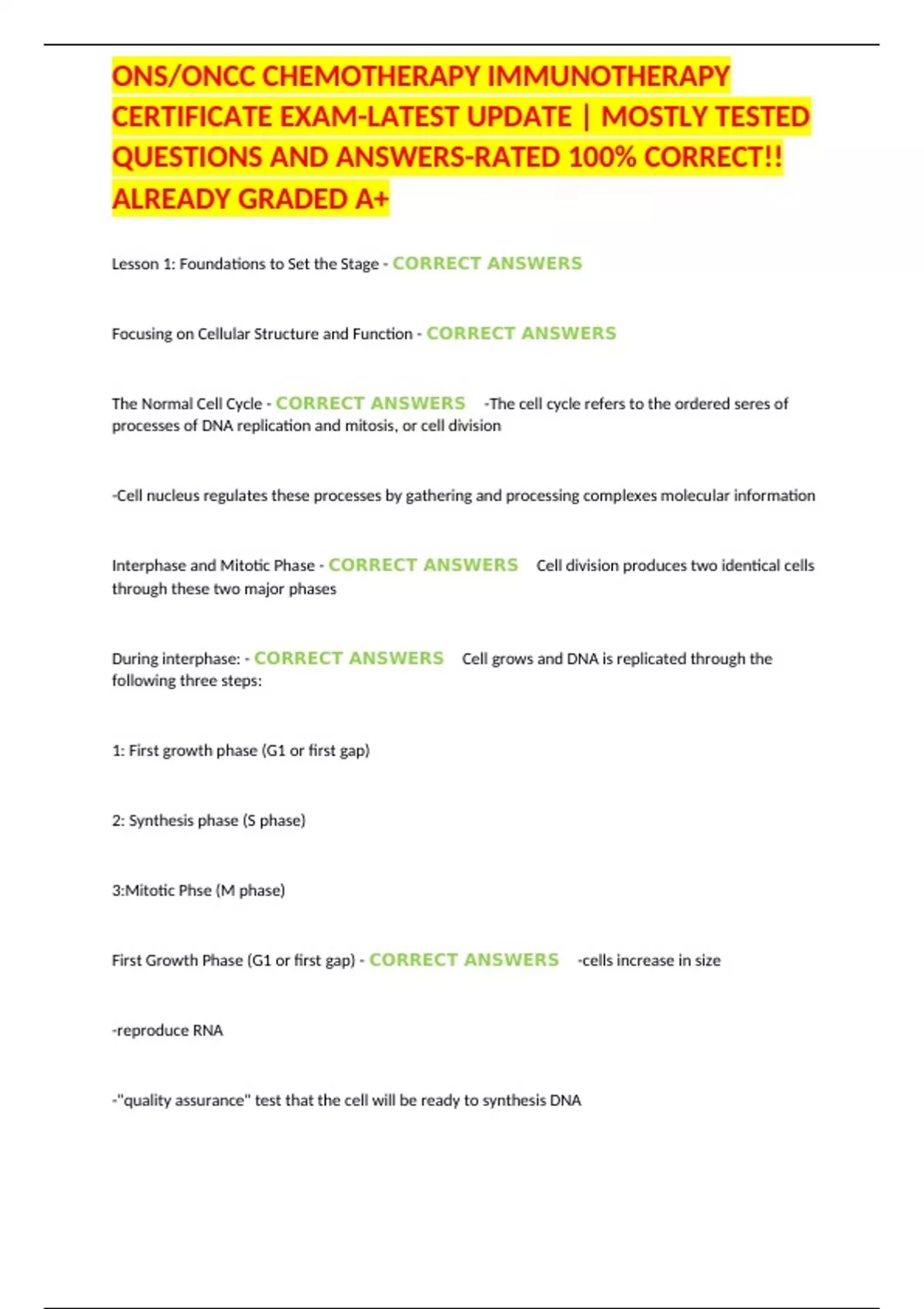 ONS/ONCC CHEMOTHERAPY IMMUNOTHERAPY CERTIFICATE EXAM-LATEST UPDATE | MOSTLY TESTED QUESTIONS AND ANSWERS-RATED 100% CORRECT!!ALREADY GRADED A+