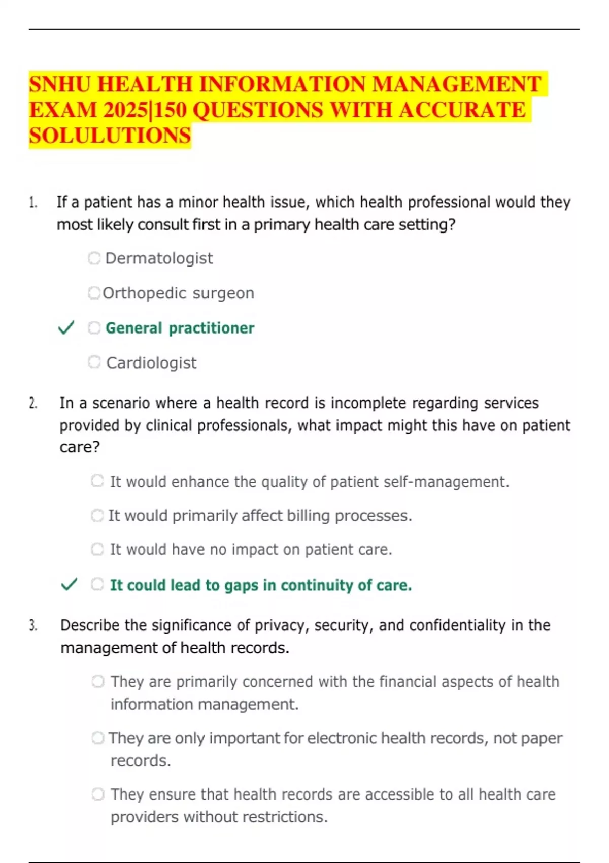 If a patient has a minor health issue, which health professional would they most likely consult first in a primary health care setting? Dermatologist Orthopedic surgeon General practitioner Cardiologist 2. In a scenario where a health record is incomplete regarding services provided by clinical professionals, what impact might this have on patient care? It would enhance the quality of patient self-management. It would primarily affect billing processes. It would have no impact on patient care. It could lead to gaps in continuity of care. 3. Describe the significance of privacy, security, and confidentiality in the management of health records. They are primarily concerned with the financial aspects of health information management. They are only important for electronic health records, not paper records. They ensu