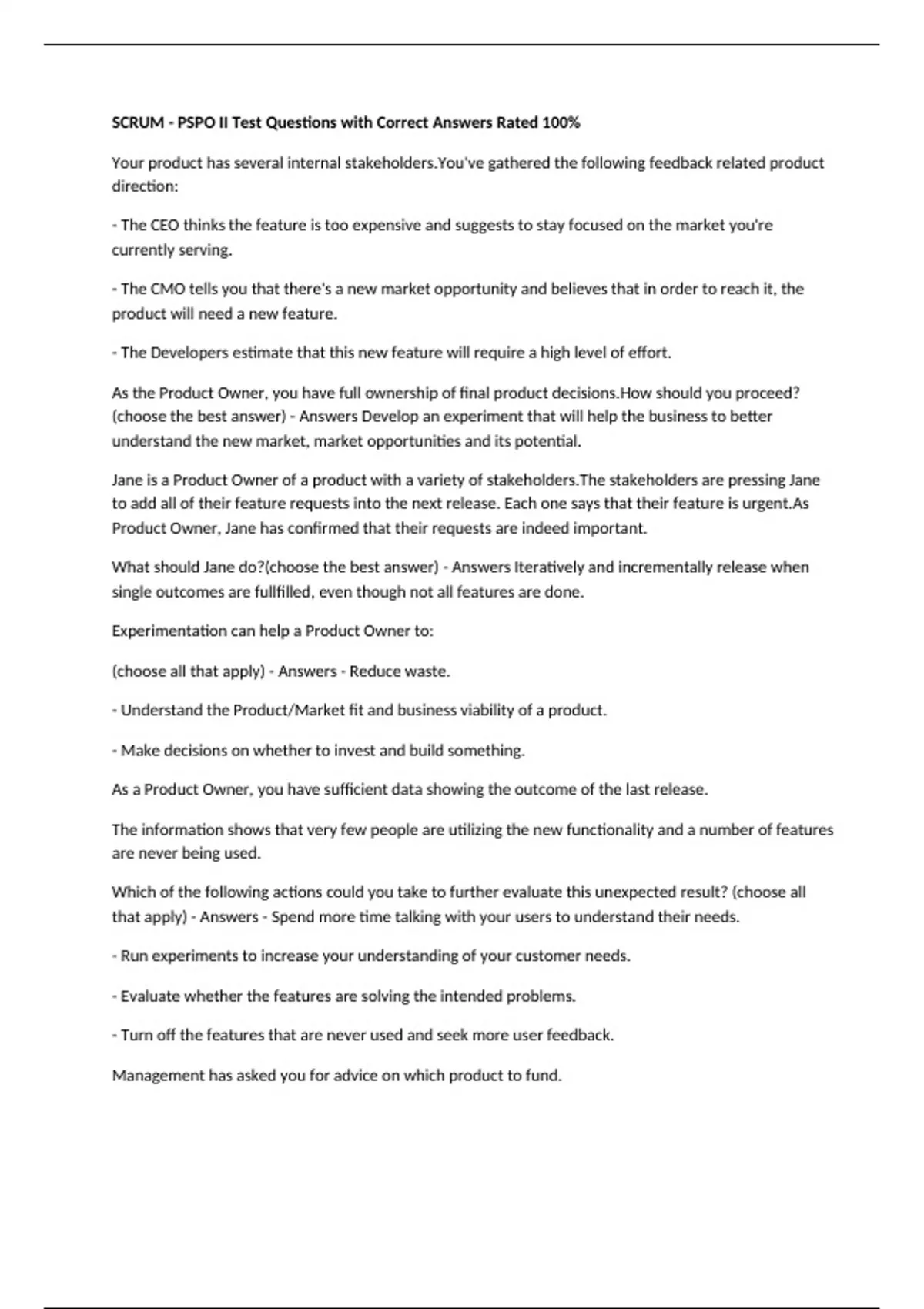 SCRUM - PSPO II Test Questions with Correct Answers Rated 100% Your product has several internal stakeholders.You've gathered the following feedback related product direction: - The CEO thinks the feature is too expensive and suggests to stay focused on the market you're currently serving. - The CMO tells you that there's a new market opportunity and believes that in order to reach it, the product will need a new feature. - The Developers estimate that this new feature will require a high level of effort. As the Product Owner, you have full ownership of final product decisions.How should you proceed?(choose the best answer) - Answers Develop an experiment that will help the business to better understand the new market, market opportunities and its potential. Jane is a Product Owner of a product with a variety of stakeholders.The stakeholders are pressing Jane to add all of their feature requests into the next release. Each one says that their feature is urgent.As Product Owner, Jane has confirmed that their requests are indeed important. What should Jane do?(choose the best answer) - Answers Iteratively and incrementally release when single outcomes are fullfilled, even though not all features are done. Experimentation can help a Product Owner to: (choose all that apply) - Answers - Reduce waste. - Understand the Product/Market fit and business viability of a product. - Make decisions on whether to invest and build something. As a Product Owner, you have sufficient data showing the outcome of the last release. The information shows that very few people are utilizing the new functionality and a number of features are never being used. Which of the following actions could you take to further evaluate this unexpected result? (choose all that apply) - Answers - Spend more time talking with your users to understand their needs. - Run experiments to increase your understanding of your customer needs. - Evaluate whether the features are solving the intended problems. - Turn off the features that are never used and seek more user feedback. Management has asked you for advice on which product to fund. Each product is focusing on different markets.Given the following information: - Product A has very high user satisfaction scores and high market share. - Product B has low user satisfaction scores, low market share, but is in a growing market in which no other competitor has significant market share. Which product would you suggest funding?(choose the best answer) - Answers Product B. Which of the following is a benefit of using Scrum as an agile approach? (choose the best answer) - Answers Managing the business' exposure to risk. What can be included in the Product Vision and Strategy that will keep people motivated about the product? (choose all that apply) - Answers - How the product will generate revenue. - How people will use the product to address their needs. - The advantages the product has over competitors. - What people will gain by using the product. Your job as a Product Owner includes sharing the Product Vision.What is the most effective way for a Product Owner to share your vision? (choose the best answer) - Answers Make a tailor-made pitch for your different stakeholder groups and adapt your vision pitch, based upon your target audience. As a Product Owner, understanding the Scrum Team's velocity will help you measure time to market and innovation rate.How does technical debt relate to velocity? (choose the two best answers) - Answers - A Scrum Team can artificially inflate velocity by allowing technical debt to be incurred. - As the Developers are working on new Product Backlog items, they can run into technical debt resulting in an unexpected slow down in velocity. Which statement is TRUE about the Cone of Uncertainty? (choose the best answer) - Answers It can be used in complex environments to help forecast when a scope of work might likely to be done. Agile approaches help organizations rapidly respond to market changes.Which measurements would be helpful in identifying improvement areas to an organization's ability to respond to change? (choose all that apply) - Answers - Cycle Time. - Velocity. - On-Product Index.