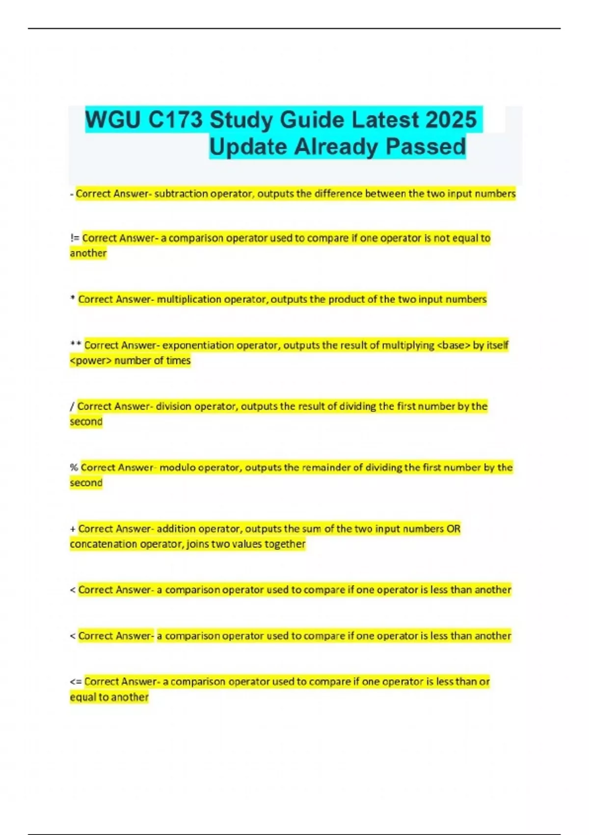 WGU C173 Study Guide Latest 2025 Update Already Passed - Correct Answer- subtraction operator, outputs the difference between the two input numbers != Correct Answer- a comparison operator used to compare if one operator is not equal to another * Correct Answer- multiplication operator, outputs the product of the two input numbers ** Correct Answer- exponentiation operator, outputs the result of multiplying <base> by itself <power> number of times / Correct Answer- division operator, outputs the result of dividing the first number by the second % Correct Answer- modulo operator, outputs the remainder of dividing the first number by the second + Correct Answer- addition operator, outputs the sum of the two input numbers OR concatenation operator, joins two values together < Correct Answer- a comparison operator used to compare if one operator is less than another < Correct Answer- a comparison operator used to compare if one operator is less than another <= Correct Answer- a comparison operator used to compare if one operator is less than or equal to another