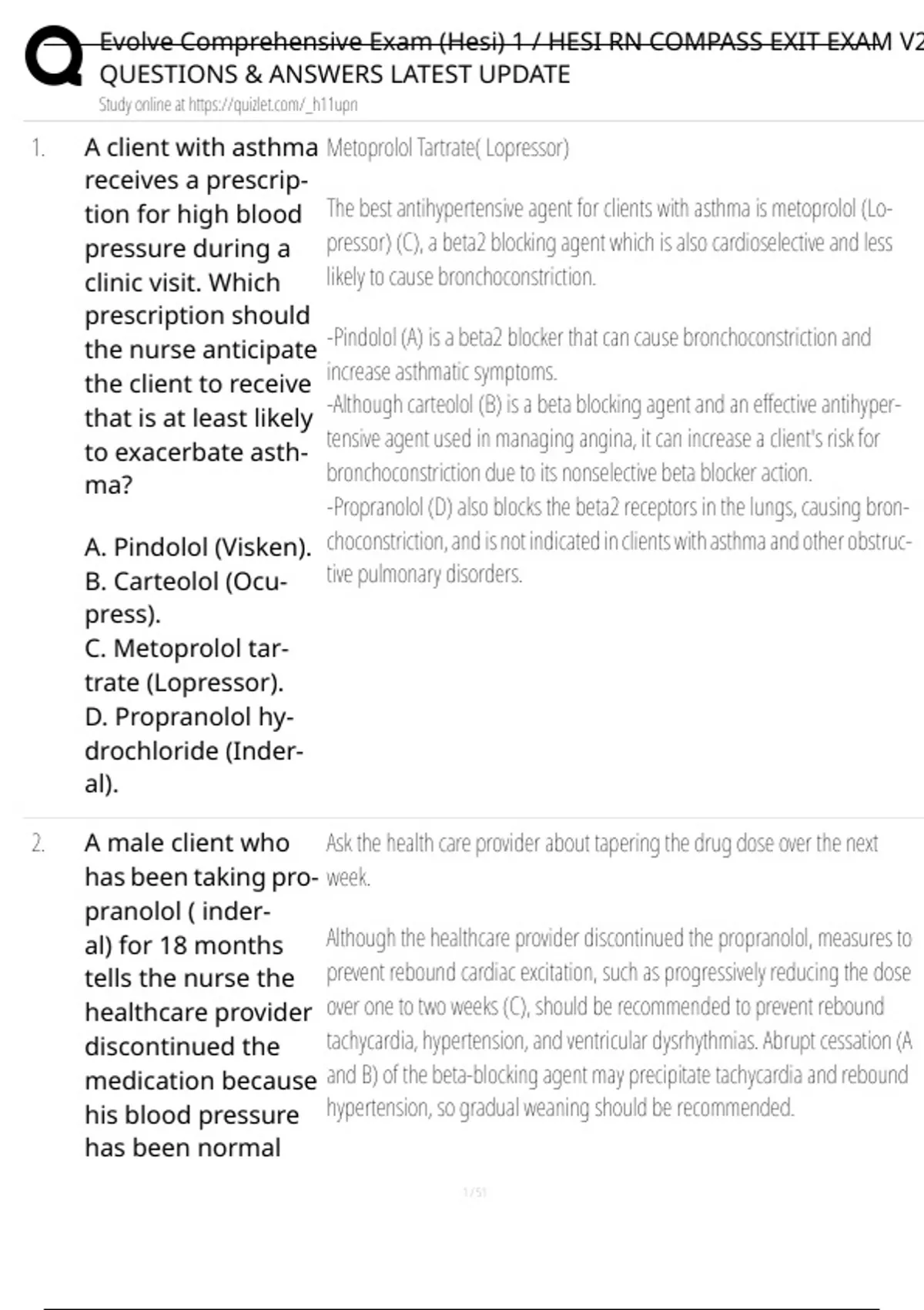 1. A client with asthma Metoprolol Tartrate( Lopressor)