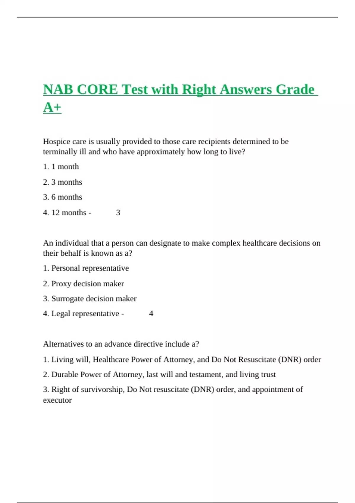 Hospice care is usually provided to those care recipients determined to be terminally ill and who have approximately how long to live? 1. 1 month 2. 3 months 3. 6 months 4. 12 months - 3 An individual that a person can designate to make complex healthcare decisions on their behalf is known as a? 1. Personal representative 2. Proxy decision maker 3. Surrogate decision maker 4. Legal representative - 4 Alternatives to an advance directive include a? 1. Living will, Healthcare Power of Attorney, and Do Not Resuscitate (DNR) order 2. Durable Power of Attorney, last will and testament, and living trust 3. Right of survivorship, Do Not resuscitate (DNR) order, and appointment of executor 4. Living trust, living will, and medical order for life-sustaining treatment - 1 A symptom of dehydration is: 1. Difficulty walking 2. Diarrhea 3. Vomiting 4. Poor skin turgor - 4 One goal of effective dementia care is to: 1. Protect care recipients from all safety hazards regardless of abilities and needs 2. Treat all care recipients the same to avoid favoritism and prevent staff from getting too close to care recipients 3. Provide personalized care based on knowledge of care recipients abilities and needs 4. Ensure that all decisions are made by a care recipient's family members - 3 An administrator decides to have care recipients participate in menu planning and grocery shopping. This policy would: 1. Free staff members for other duties 2. Violate sanitation regulations 3. Reduce dietary costs 4. Help care recipients to maintain a sense of involvement and of being needed - 4 ROM is an abbreviation for: 1. Range of motion 2. Rehabilitative outcome measurement 3. Rehabilitative outcome management 4. Range of measurement - 1 What word is defined as an acquired, persistent impairment of intellectual function with compromise in at least three spheres of mental activity? 1. Alzheimer's 2. Delirium 3. Dementia 4. Encephalopathy - 3