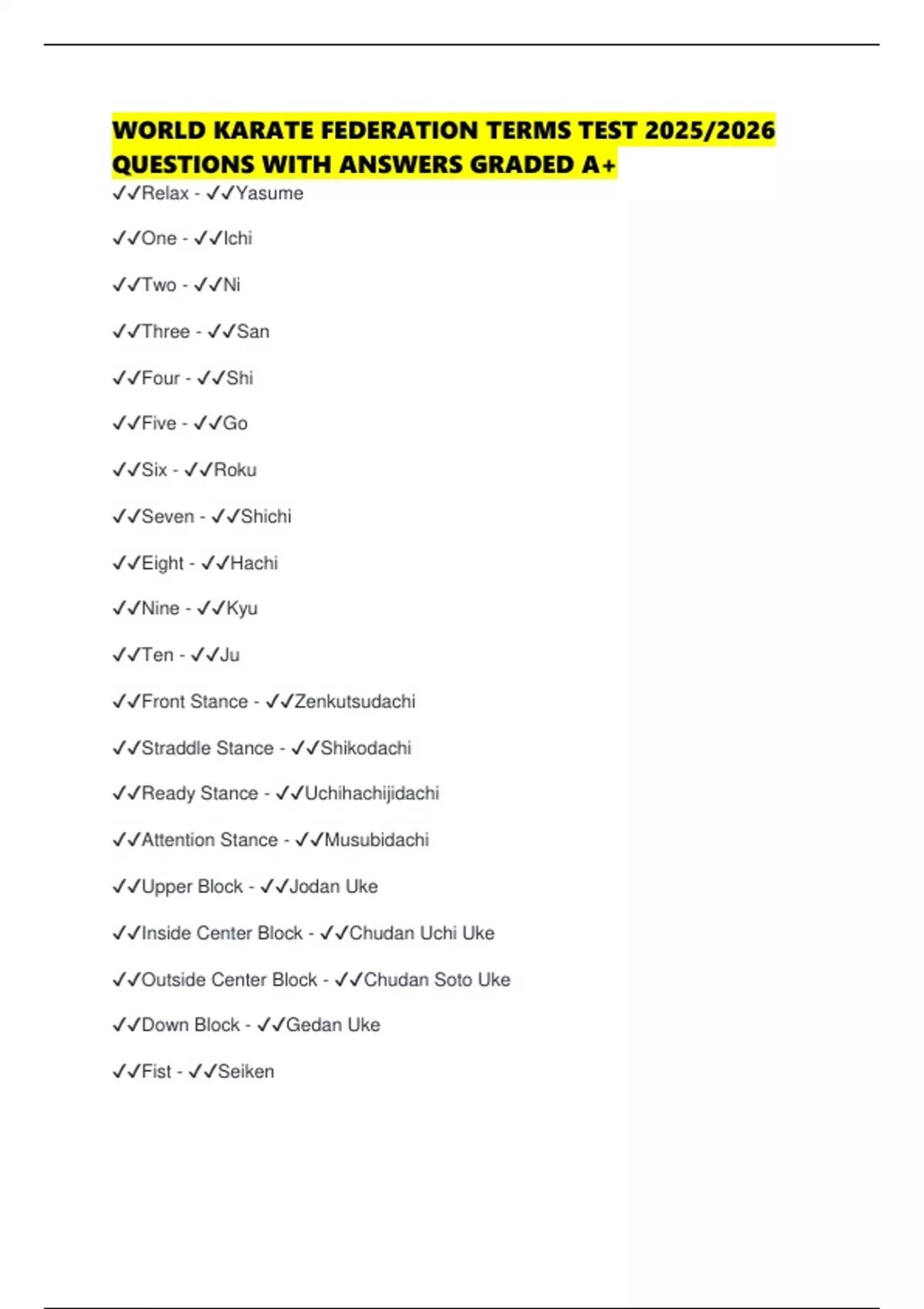WORLD KARATE FEDERATION TERMS TEST 2025/2026 QUESTIONS WITH ANSWERS GRADED A+