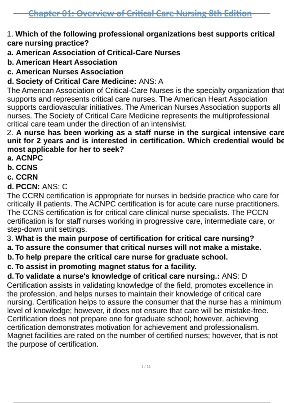 Critical C are Nursing 8th Edition question and answers a+