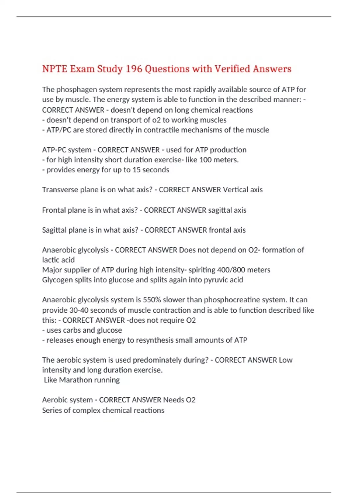 NPTE Exam Study 196 Questions with Verified Answers The phosphagen system represents the most rapidly available source of ATP for use by muscle. The energy system is able to function in the described manner: - CORRECT ANSWER - doesn't depend on long chemical reactions - doesn't depend on transport of o2 to working muscles - ATP/PC are stored directly in contractile mechanisms of the muscle ATP-PC system - CORRECT ANSWER - used for ATP production - for high intensity short duration exercise- like 100 meters. - provides energy for up to 15 seconds Transverse plane is on what axis? - CORRECT ANSWER Vertical axis Frontal plane is in what axis? - CORRECT ANSWER sagittal axis Sagittal plane is in what axis? - CORRECT ANSWER frontal axis Anaerobic glycolysis - CORRECT ANSWER Does not depend on O2- formation of lactic acid Major supplier of ATP during high intensity- spiriting 400/800 meters Glycogen splits into glucose and splits again into pyruvic acid Anaerobic glycolysis system is 550% slower than phosphocreatine system. It can provide 30-40 seconds of muscle contraction and is able to function described like this: - CORRECT ANSWER -does not require O2 - uses carbs and glucose - releases enough energy to resynthesis small amounts of ATP
