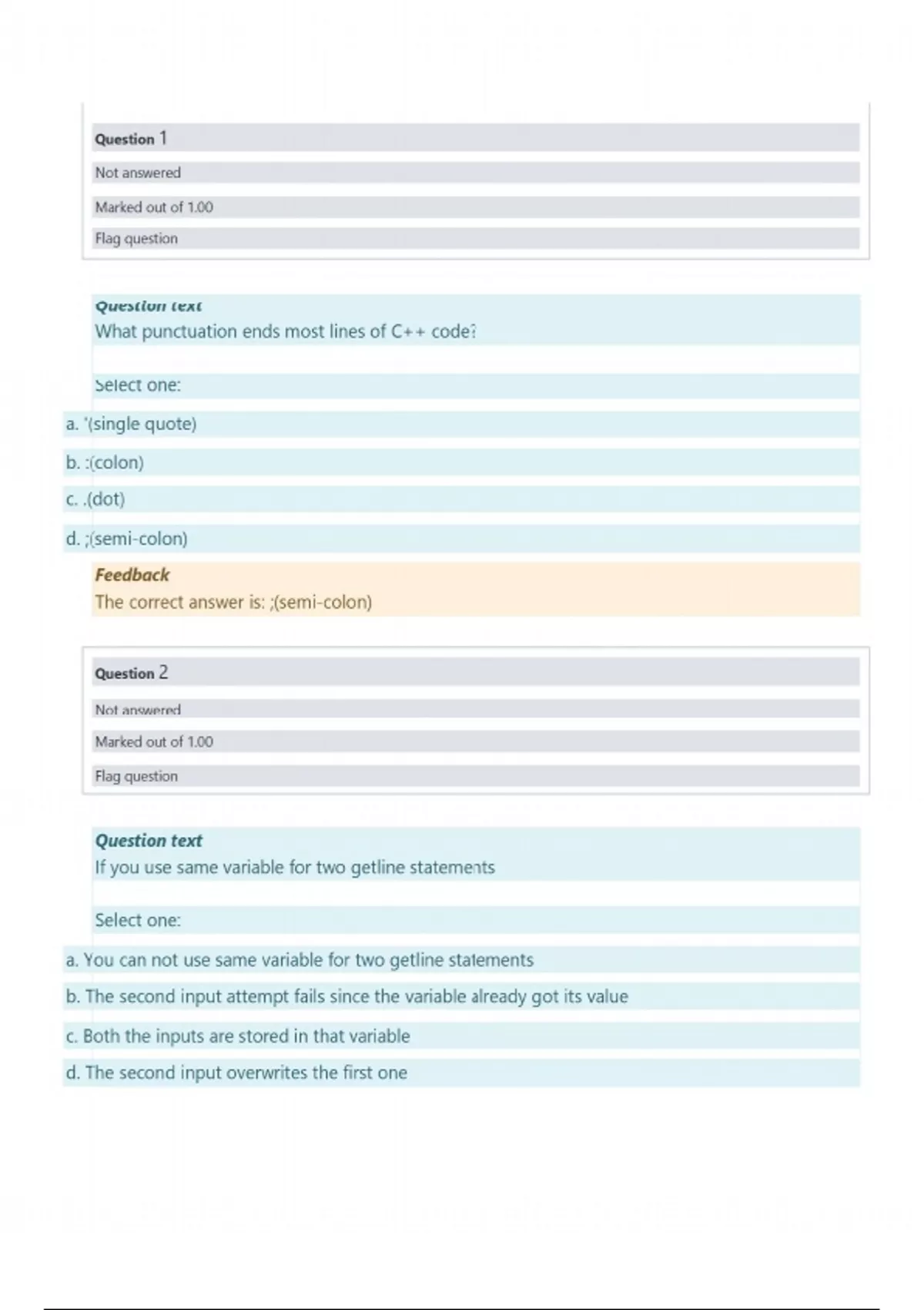 Question 1 Not answered Marked out of 1.00 Flag question Question text What punctuation ends most lines of C++ code? Select one: a. '(single quote) b. :(colon) c. .(dot) d. ;(semi-colon) Feedback The correct answer is: ;(semi-colon) Question 2 Not answered Marked out of 1.00 Flag question Question text If you use same variable for two getline statements Select one: a. You can not use same variable for two getline statements b. The second input attempt fails since the variable already got its value c. Both the inputs are stored in that variable d. The second input overwrites the first one Feedback The correct answer is: The second input overwrites the first one Question 3 Not answered Marked out of 1.00 Flag question Question text What is polymorphism in object oriented programming? Select one: A. Pogramming using objects and classes to provide a well documented program. B. Is a form of software reuse in which new classes absorb the data and behaviors of existing classes and embellish these classes with new capabilities. C. Involves a base-class pointer or reference to invoke virtual functions on base-class and derived-class object. D. Classe that provides a base class from wich other classes can inherit. Feedback The correct answer is: Involves a base-class pointer or reference to invoke virtual functions on base-class and derived-class object. Question 4 Not answered Marked out of 1.00 Flag question Question text Which of the following is selection statement in C++? Select one: a. exit b. break c. switch d. goto Feedback The correct answer is: switch Question 5 Not answered Marked out of 1.00 Flag question Question text When following piece of code is executed, what happens? b = 3; a = b++; Select one: a. a contains 4 and b contains 3 b. a contains 3 and b contains 4 c. a contains 3 and b contains 3 d. a contains 4 and b contains 4 Feedback The correct answer is: a contains 3 and b contains 4 Question 6 Not answered Marked out of 1.00 Flag question Question text When deriving a class from a base class with protected iheritance, public members of base class become________members of the derived class, and protected members of the base class become________members of the derived class. Select one: A. protected, public B. protected, protected C. public, protected D. public, public Feedback The correct answer is: protected, protected Question 7 Not answered Marked out of 1.00 Flag question Question text What is the final value of x when the code int x; for(x=0; x<10; x++) {} is run? Select one: a. 10 b. 1 c. 9 d. 0 Feedback The correct answer is: 10 Question 8 Not answered Marked out of 1.00 Flag question Question text Which of the following is not a looping statement in C++? Select one: a. until b. do c. while d. for Feedback The correct answer is: until Question 9 Not answered Marked out of 1.00 Flag question Question text If an array of objects is of size 10 and a data value have to be retrieved from 5th object then ________________ syntax should be used. Select one: A. Array_Name[4].data_variable_name; B. Array_Name[4].data_variable_; C. Array_Name[4].data_variable_name(value); D. Data_Type Array_Name[4].data_variable_name; Feedback The correct answer is: Array_Name[4].data_variable_name; Question 10 Not answered Marked out of 1.00 Flag question Question text What will be the output of the following C++ code? #include <iostream> using namespace std; void square (int *x, int *y) { *x = (*x) * --(*y); } int main ( ) { int number = 30; square(&number, &number); cout << number; return 0; } Select one: A. 870 B. 9 C. 920 D. 30 Feedback The correct answer is: 870 Question 11 Not answered Marked out of 1.00 Flag question Question text You must specify void in parameters if a function does not have any arguments. Select one: a. False b. True Feedback The correct answer is: False Question 12 Not answered Marked out of 1.00 Flag question Question text Which of the following is output statement in C++? Select one: a. write b. cin c. cout d. print Feedback The correct answer is: cout Question 13 Not answered Marked out of 1.00 Flag question Question text Variables inside parenthesis of functions declarations have _____ level access. Select one: a. Universal b. Global c. Module d. Local Feedback The correct answer is: Local Question 14 Not answered Marked out of 1.00 Flag question Question text A template class Select one: a. is designed to be stored in different containers b. generates objects which must be identical c. generates classes with different numbers of member functions. d. works with different data types Feedback The correct answer is: works with different data types Question 15 Not answered Marked out of 1.00 Flag question Question text Observe following function declaration and choose the best answer: int divide ( int a, int b = 2 ) Select one: a. Variable b is international scope and will have value 2 b. Variable a and b are of int type and the initial value of both variables is 2 c. Variable b will have value 2 if not specified when calling function d. Variable b is of integer type and will always have value 2 Feedback The correct answer is: Variable b will have value 2 if not specified when calling function Question 16 Not answered Marked out of 1.00 Flag question Question text A virtual class is the same as Select one: a. a base class b. an abstract class c. a class with a virtual function d. none of the option. Feedback The correct answer is: none of the option. Question 17 Not answered Marked out of 1.00 Flag question Question text Predict the output of following C++ program #include<iostream> using namespace std; class Empty {}; int main() { cout << sizeof(Empty); return 0; } Select one: A. Runtime Error B. 0 C. A non-zero value D. Compiler Error Feedback The correct answer is: A non-zero value Question 18 Not answered Marked out of 1.00 Flag question Question text A copy constructor takes Select one: a. arbitrary no. of arguments b. two arguments c. one argument d. no argument Fe