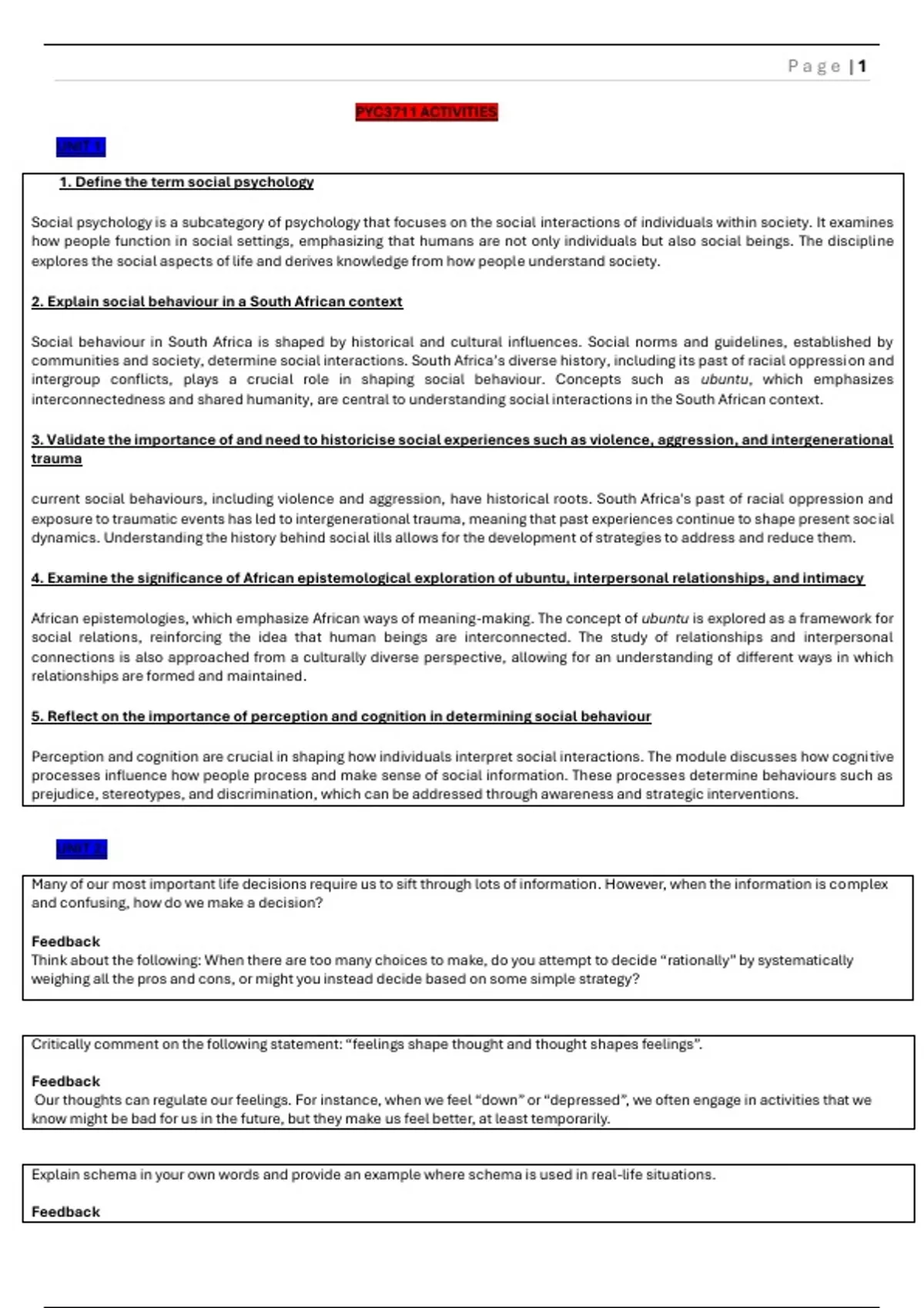 This is an in depth and concise summary of the module Social Psychology. It includes practice questions and answers for each unit. The summary goes through all the prescribed work and prescribed readings for the module. This is all the necessary information that you will need for the exam.