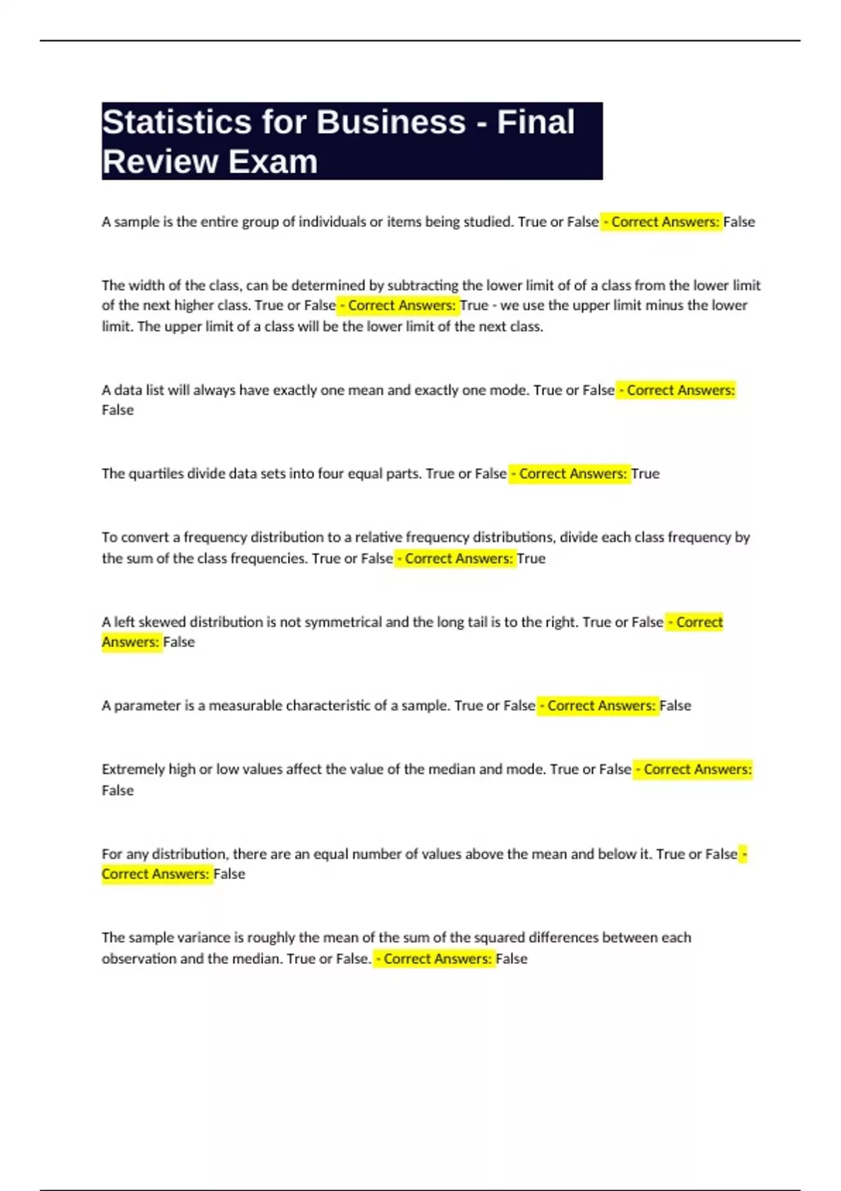 Statistics for Business - Final Review Exam A sample is the entire group of individuals or items being studied. True or False - Correct Answers: False The width of the class, can be determined by subtracting the lower limit of of a class from the lower limit of the next higher class. True or False - Correct Answers: True - we use the upper limit minus the lower limit. The upper limit of a class will be the lower limit of the next class. A data list will always have exactly one mean and exactly one mode. True or False - Correct Answers: False The quartiles divide data sets into four equal parts. True or False - Correct Answers: True To convert a frequency distribution to a relative frequency distributions, divide each class frequency by the sum of the class frequencies. True or False - Correct Answers: True A left skewed distribution is not symmetrical and the long tail is to the right. True or False - Correct Answers: False A parameter is a measurable characteristic of a sample. True or False - Correct Answers: False Extremely high or low values affect the value of the median and mode. True or False - Correct Answers: False For any distribution, there are an equal number of values above the mean and below it. True or False - Correct Answers: False The sample variance is roughly the mean of the sum of the squared differences between each observation and the median. True or False. - Correct Answers: False A data set has 80 observations. Using the 2 to the K rule, what is the number classes? - Correct Answers: 7 -- 2^7 is the first value that is above 80. 2^6 is only 64. A ---- is a bar graph in which the height of each rectangle is the frequency or relative frequency of the class/category. The width of each rectangle is the same, and the rectangles do not touch each other. - Correct Answers: Bar Chart After constructing any frequency distribution for a sample, what should be the sum of the frequencies. - Correct Answers: Sample size Which information can you obtain from a box plot but not from histogram? - Correct Answers: Largest and smallest values A group of 100 students were surveyed about their interest in a new International Studies program. Interest was measured in terms of high, medium, or low. 30 students responded high interest; 50 students responded medium interest, 20% students responded low interest. What is the type of the variable interest? - Correct Answers: Ordinal A histogram of a dataset indicates that the distribution of the data is skewed left, which measure of central tendency will likely be smaller, the mean or the median? - Correct Answers: Mean Find the sample standard deviation based on the following report from StatCrunch -- Variance is 4824.77278 - Correct Answers: The sample standard deviation is the square root of the variance which would be 69.46 The lifetime (in weeks) of a certain type of lightbulb is approximately bell-shaped, with mean 252 and standard deviation of 8. If one lightbulb from this distribution has a z-scores of +3, what is its lifetime? - Correct Answers: -2 and +1 The lifetime (in weeks) of a certain type of lightbulb is approximately bell-shaped, with mean 252 and standard deviation of 8. By using Empirical Rule, what percent of lightbulb has its lifetime between 236 and 260? - Correct Answers: 81.5% The lifetime (in weeks) of a certain type of lightbulb is approximately bell-shaped, with mean 252 and standard deviation of 8. By using Empirical Rule, what percent of lightbulb has its lifetime greater than 268? - Correct Answers: 2.5% Which measures of center are not affected by extremely small or extremely large values? - Correct Answers: Median and Mode The mean, as a measure of center would be the least appropriate for which of the following? - Correct Answers: Marital status of college students at a particular university. Rank the measures of spread in terms of their relative computational difficulty, from least to most difficulty. - Correct Answers: Range, IQR, Variance The following is a box plot for test 1 and test 2 of math 1065 The bottom one if for test 1. State the shape of the distribution for test 1 and test 2. - Correct Answers: Left skewed and right skewed. Probability is a measure of the likelihood of random phenomenon or chance behavior. True or False - Correct Answers: True A coin is tossed two times. The probability is 1/2 that both two tosses will result in a head face up. True or false - Correct Answers: False Two events E and F are disjoint, if the occurrence of event E in a probability experiment does not affect the probability of event F. True or False - Correct Answers: False To apply the special AND rule, the events must be disjoint. - Correct Answers: False the probability of two independent events, A and B, is computed as P(A and B) = P(A) x P(B). True or False - Correct Answers: True The complement rule states that the probability of an event not occurring is equal to one minus the probability of its occurrence. True or False - Correct Answers: True In the following Venn Diagram, event A and event B are disjoint. - Correct Answers: True A random variance is assigned numerical values based on the outcomes of an experiment. True or False - Correct Answers: True A discrete random variable can have only certain clearly separated values. True or False - Correct Answers: True A probability distribution of discrete random variable is a listing of possible numerical values that can occur by chance and their corresponding probabilities. True or False - Correct Answers: True The sample space of an experiment is S = {1,3,5,7,9,11,12,15}. If event E={1,3,5,7,9,15} and Event F={9,11,12,15}, list the outcomes in E OR F - Correct Answers: {1,3,5,7,9,11,12,15} The sample space of an experiment is S = {1,3,5,7,9,11,12,15}. If event E={1,3,5,7,9,15} and Event F={9,11,12,15}. suppose the outcomes are equally likely, what is the probability that event E and event F both occur? - Correct Answers: 2/8 If P(E)= 0.25 and P(F)=0.45. Fin