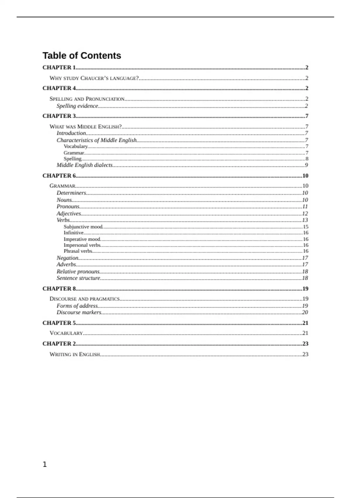 This summary contains 99% of the material you have to study from Horobin's Chaucer's Language for the midterm and final of Philology 1. The other 1% are some bits of chapter 3 and 2 that I had not included, but they are brief parts.