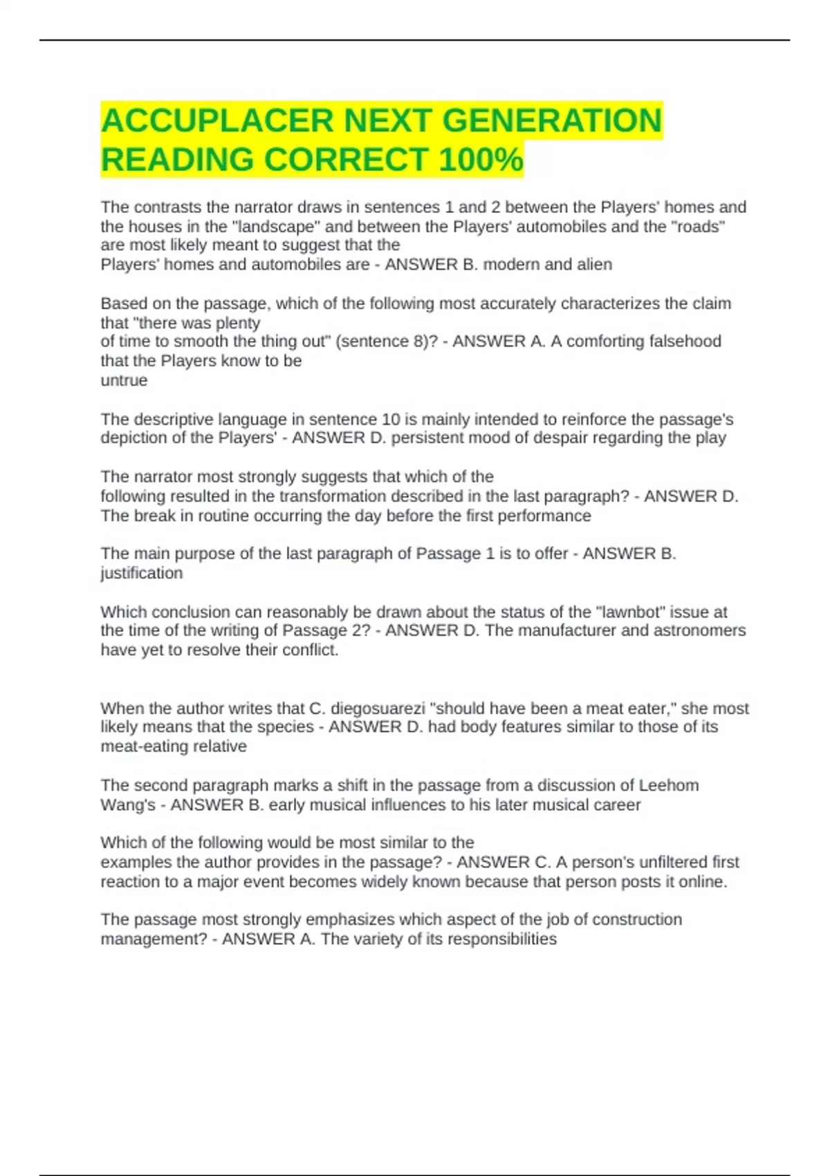 ACCUPLACER NEXT GENERATION READING CORRECT 100%