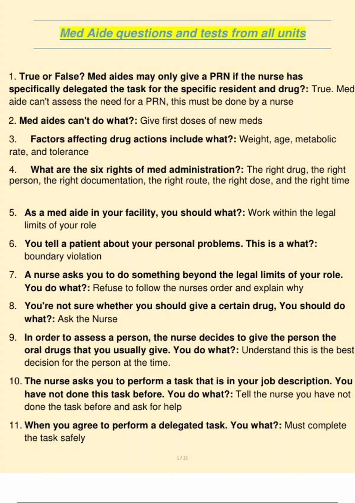 PREPARE FOR SUCCESS! MASTER ALL MEDICATION AIDE UNITS WITH THIS COMPLETE PRACTICE RESOURCE. ACE YOUR EXAM WITH ACCURATE QUESTIONS, DETAILED, 100% CORRECT, VERIFIED ANSWERS, AND ACHIEVE THAT A+ GRADE. BOOST YOUR CONFIDENCE AND KNOWLEDGE NOW!
