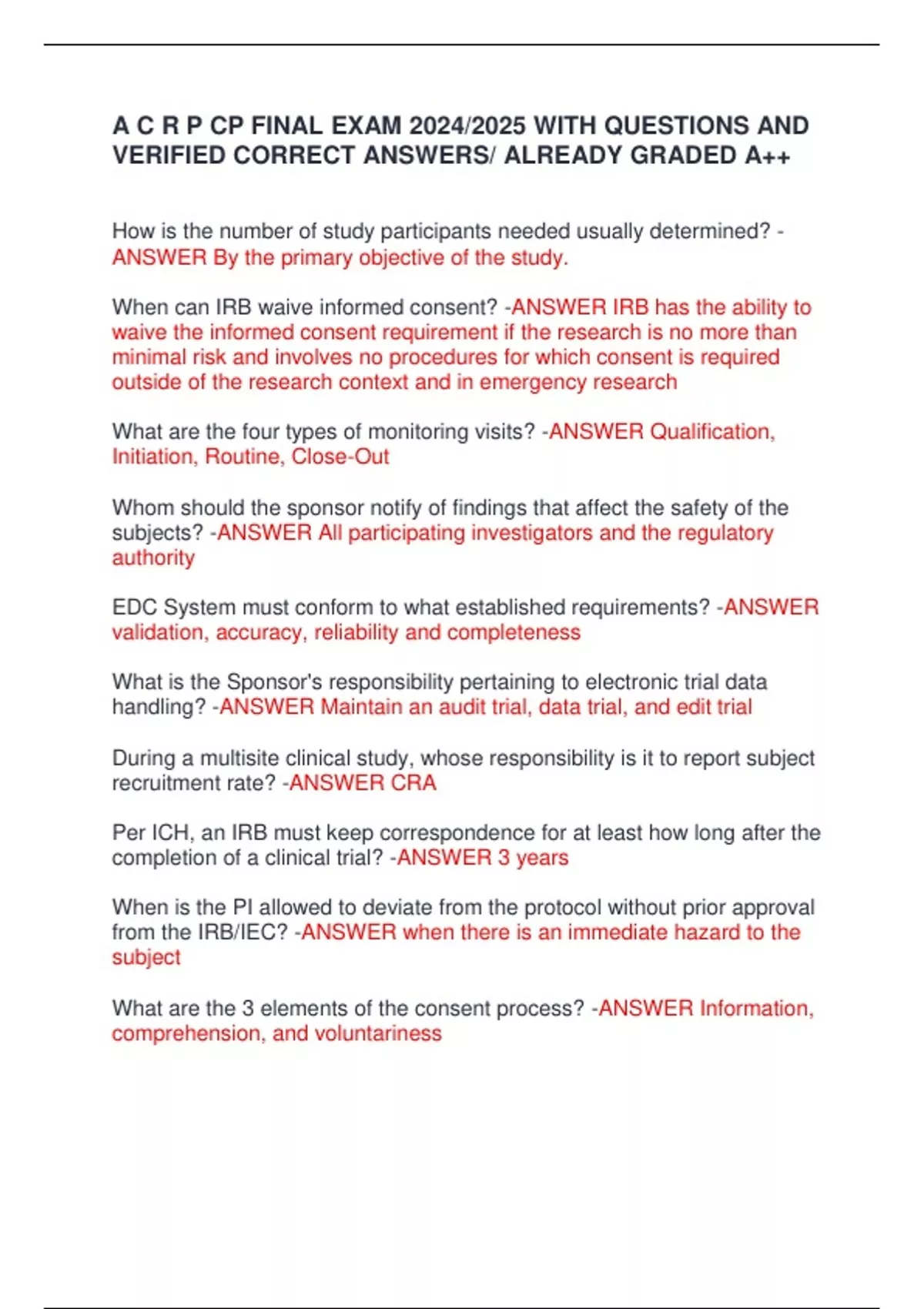 A C R P CP FINAL EXAM 2024/2025 WITH QUESTIONS AND VERIFIED CORRECT ANSWERS/ ALREADY GRADED A++ A C R P CP FINAL EXAM 2024/2025 WITH QUESTIONS AND VERIFIED CORRECT ANSWERS/ ALREADY GRADED A++