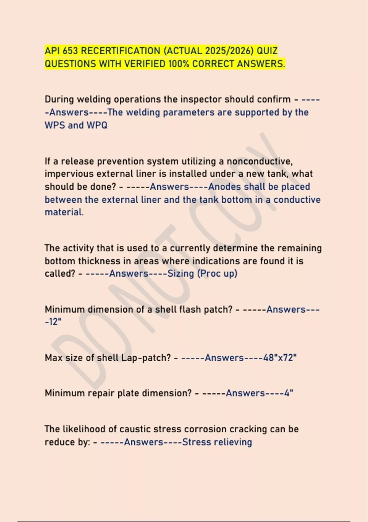 API 653 RECERTIFICATION (ACTUAL 2025/2026) QUIZ QUESTIONS WITH VERIFIED 100% CORRECT ANSWERS