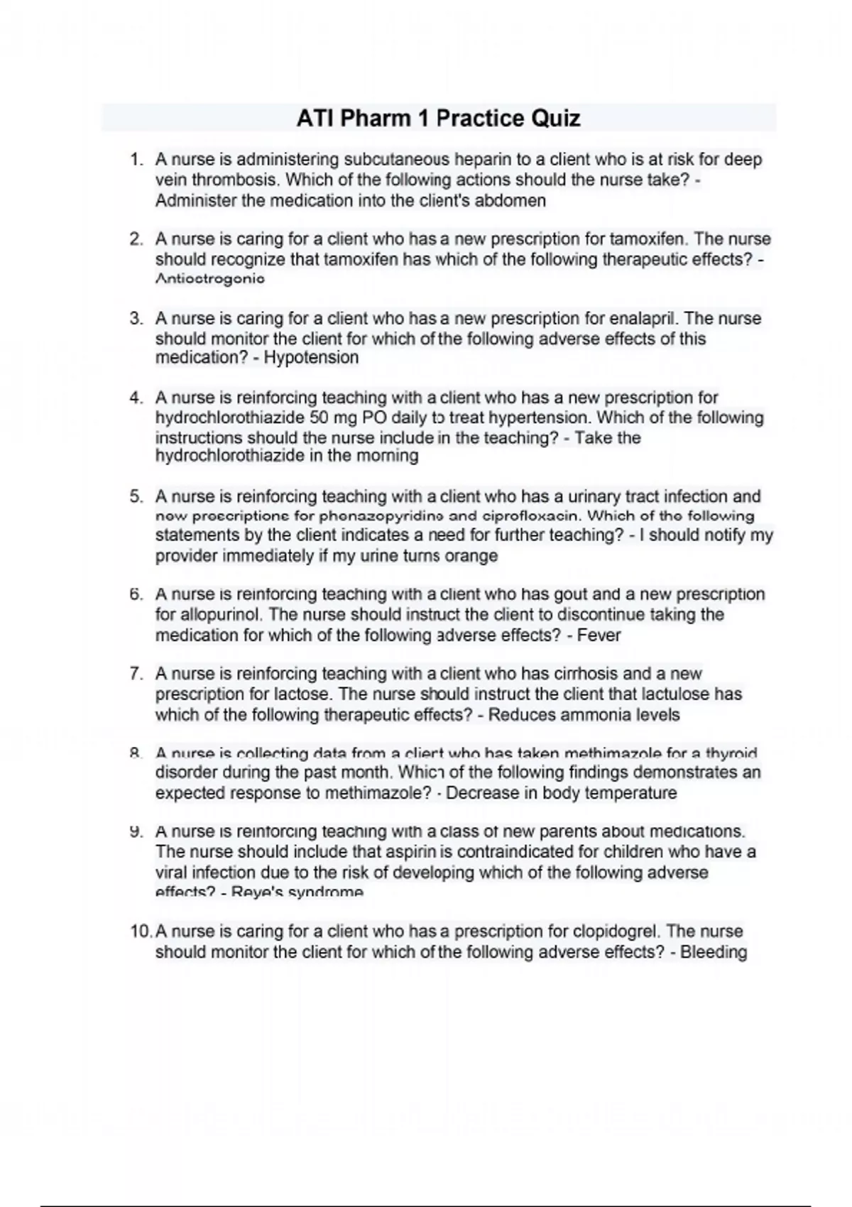 1. A nurse is administering subcutaneous heparin to a client who is at risk for deep vein thrombosis. Which of the following actions should the nurse take? - Administer the medication into the client's abdomen 2. A nurse is caring for a client who has a new prescription for tamoxifen. The nurse should recognize that tamoxifen has which of the following therapeutic effects? - Antiestrogenic 3. A nurse is caring for a client who has a new prescription for enalapril. The nurse should monitor the client for which of the following adverse effects of this medication? - Hypotension 4. A nurse is reinforcing teaching with a client who has a new prescription for hydrochlorothiazide 50 mg PO daily to treat hypertension. Which of the following instructions should the nurse include in the teaching? - Take the hydrochlorothiazide in the morning 5. A nurse is reinforcing teaching with a client who has a urinary tract infection and new prescriptions for phenazopyridine and ciprofloxacin. Which of the following statements by the client indicates a need for further teaching? - I should notify my provider immediately if my urine turns orange 6. A nurse is reinforcing teaching with a client who has gout and a new prescription for allopurinol. The nurse should instruct the client to discontinue taking the medication for which of the following adverse effects? - Fever 7. A nurse is reinforcing teaching with a client who has cirrhosis and a new prescription for lactose. The nurse should instruct the client that lactulose has which of the following therapeutic effects? - Reduces ammonia levels 8. A nurse is collecting data from a client who has taken methimazole for a thyroid disorder during the past month. Which of the following findings demonstrates an expected response to methimazole? - Decrease in body temperature 9. A nurse is reinforcing teaching with a class of new parents about medications. The nurse should include that aspirin is contraindicated for children who have a viral infection due to the risk of developing which of the following adverse effects? - Reye's syndrome 10. A nurse is caring for a client who has a prescription for clopidogrel. The nurse should monitor the client for which of the following adverse effects? - Bleeding 11. A nurse is caring for a client who has a new diagnosis of oral candidiasis after taking tetracycline for 7 days. The nurse should recognize that candidiasis is a manifestation of which of the following adverse effects? - Superinfection 12. A nurse is caring for a client who has a prescription for chlorothiazide to treat hypertension. The nurse should plan to monitor the client for which of the following adverse effects? - Muscle weakness 13. A nurse is caring for an older adult client who has a new prescription for amitriptyline to treat depression. Which of the following diagnostic tests should the nurse plan to obtain prior to administering the medication? - Electrocardiogram 14. A nurse is caring for an older adult client who has a prescription for zolpidem at bedtime to promote sleep. The nurse should plan to monitor the client for which of the following adverse effects? - Dizziness 15. A nurse is reinforcing teaching with a newly licensed nurse about caring for a client who has a prescription for gemfibrozil. The nurse should instruct the newly licensed nurse to monitor which of the following laboratory tests? - Liver function 16. A nurse is reinforcing teaching with a client who has ulcerative colitis and a new prescription for sulfasalazine. The nurse should instruct the client to monitor for which of the following adverse effects of this medication? - Arthralgia 17. A nurse is reinforcing teaching with a parent of a child who has asthma and a new prescription for cromolyn metered dose inhaler. Which of the following statements by the parent indicates a need for further teaching? - I will give my child a dose as soon as wheezing starts 18. A nurse is caring for a client who has peptic ulcer disease and reports a headache. Which of the following medications should the nurse plan to administer? - Acetaminophen 19. A nurse is caring for a client who has a new prescription for ergotamine. The nurse should recognize that ergotamine is administered to treat which of the following conditions? - Migraine headaches 20. A nurse is reinforcing teaching with a newly licensed nurse about metoclopramide. The nurse should include in the teaching that which of the following conditions is a contraindication to this medication? - Intestinal obstruction 21. A nurse is reinforcing teaching with a client who has rheumatoid arthritis and a prescription for long term prednisone therapy. The nurse should instruct the client to monitor for which of the following adverse effects? - Stress fractures