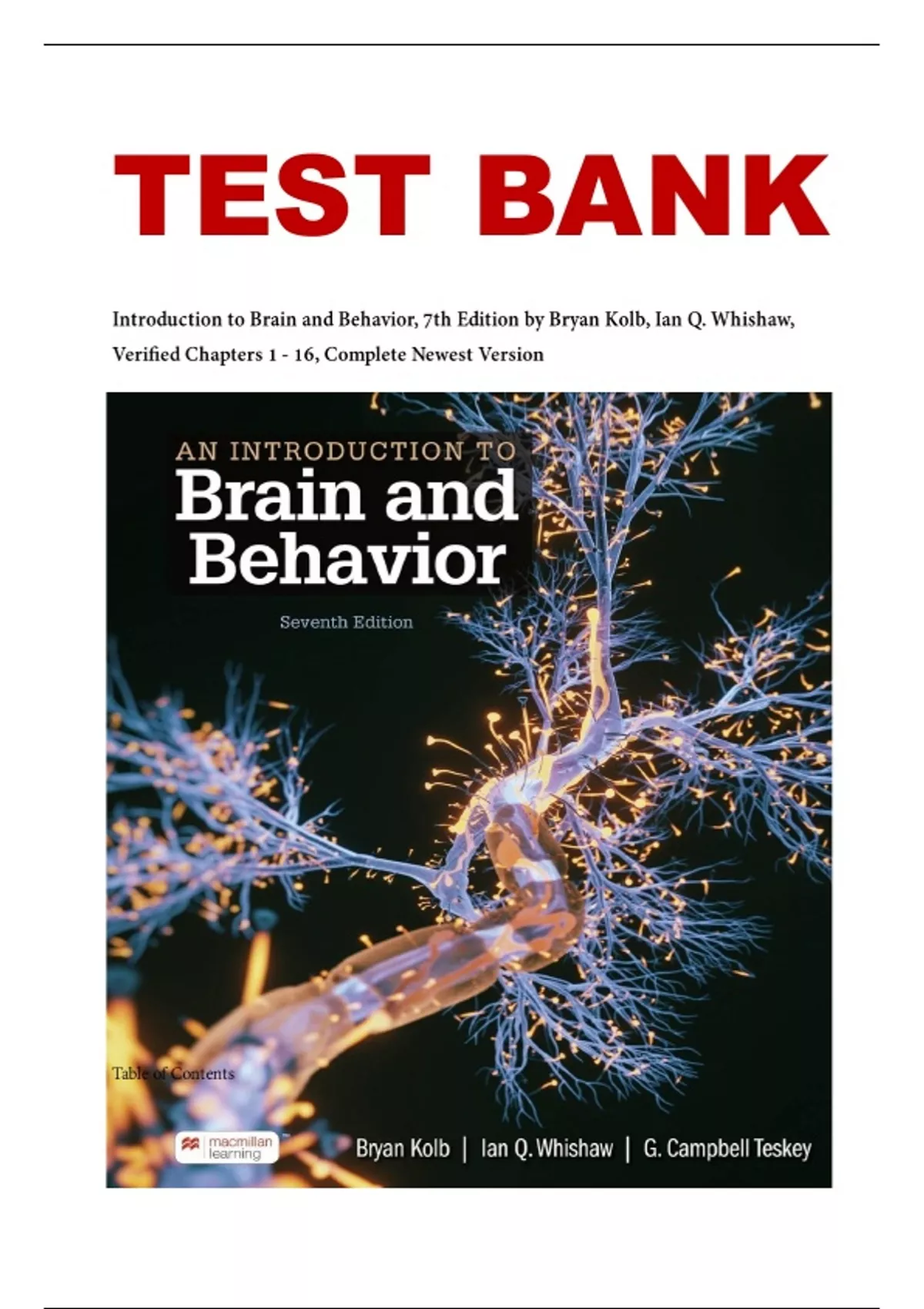 Enhance your understanding of neuroscience and behavioral psychology with this verified Test Bank for An Introduction to Brain and Behavior, 7th Edition by Bryan Kolb and Ian Q. Whishaw. Covering Chapters 1–16, this newest edition features accurate, up-to-date multiple-choice, true/false, and applied questions that reflect core topics such as brain anatomy, neural signaling, sensory systems, memory, emotion, and cognition. Designed for college-level courses, this test bank is an excellent study resource for exams, quizzes, and academic success.