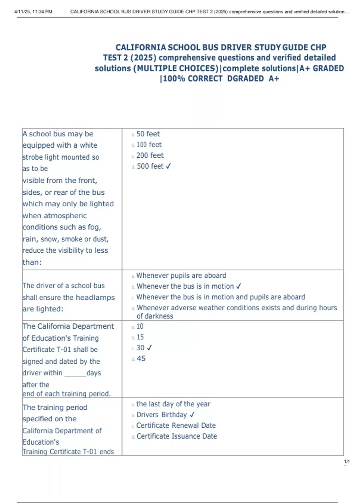 4/11/25, 11:34 PM CALIFORNIA SCHOOL BUS DRIVER STUDY GUIDE CHP TEST 2 (2025) comprehensive questions and verified detailed solution…
