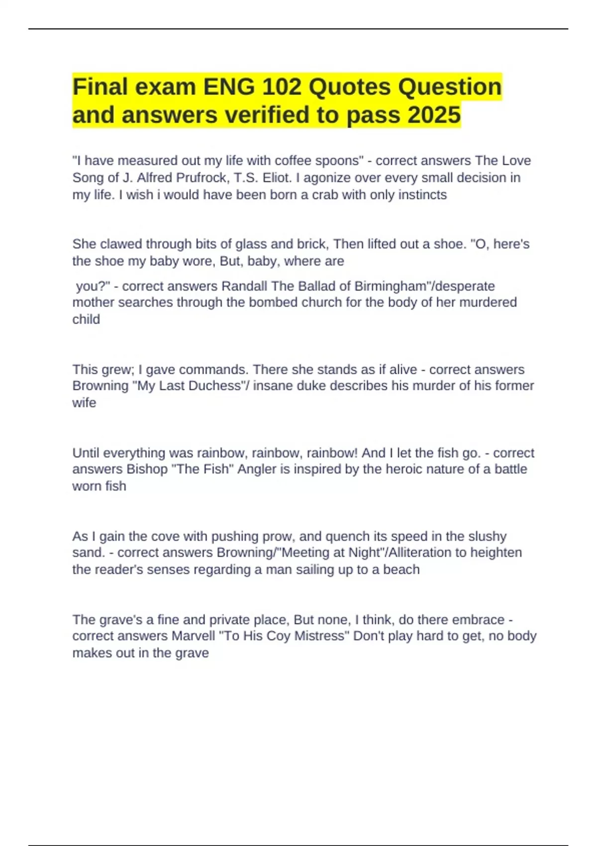 Final exam ENG 102 Quotes Question and answers verified to pass 2025 "I have measured out my life with coffee spoons" - correct answers The Love Song of J. Alfred Prufrock, T.S. Eliot. I agonize over every small decision in my life. I wish i would have been born a crab with only instincts She clawed through bits of glass and brick, Then lifted out a shoe. "O, here's the shoe my baby wore, But, baby, where are you?" - correct answers Randall The Ballad of Birmingham"/desperate mother searches through the bombed church for the body of her murdered child This grew; I gave commands. There she stands as if alive - correct answers Browning "My Last Duchess"/ insane duke describes his murder of his former wife Until everything was rainbow, rainbow, rainbow! And I let the fish go. - correct answers Bishop "The Fish" Angler is inspired by the heroic nature of a battle worn fish