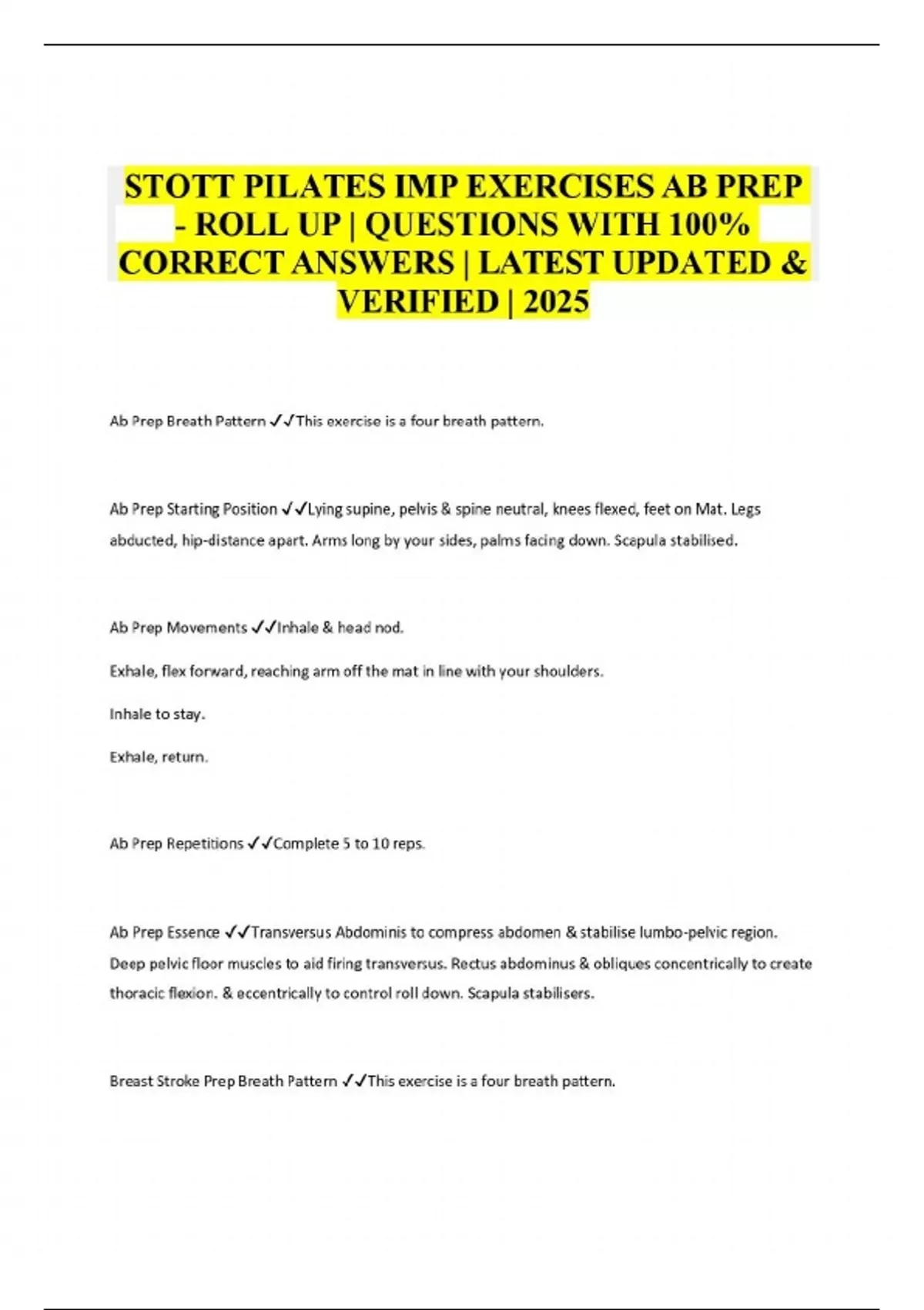 STOTT PILATES IMP EXERCISES AB PREP - ROLL UP | QUESTIONS WITH 100% CORRECT ANSWERS | LATEST UPDATED & VERIFIED | 2025