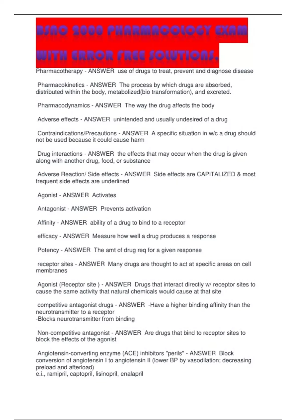 Pharmacotherapy - ANSWER use of drugs to treat, prevent and diagnose disease Pharmacokinetics - ANSWER The process by which drugs are absorbed, distributed within the body, metabolized(bio transformation), and excreted. Pharmacodynamics - ANSWER The way the drug affects the body Adverse effects - ANSWER unintended and usually undesired of a drug Contraindications/Precautions - ANSWER A specific situation in w/c a drug should not be used because it could cause harm Drug interactions - ANSWER the effects that may occur when the drug is given along with another drug, food, or substance Adverse Reaction/ Side effects - ANSWER Side effects are CAPITALIZED & most frequent side effects are underlined Agonist - ANSWER Activates Antagonist - ANSWER Prevents activation Affinity - ANSWER ability of a drug to bind to a receptor efficacy - ANSWER Measure how well a drug produces a response Potency - ANSWER The amt of drug req for a given response receptor sites - ANSWER Many drugs are thought to act at specific areas on cell membranes Agonist (Receptor site ) - ANSWER Drugs that interact directly w/ receptor sites to cause the same activity that natural chemicals would cause at that site competitive antagonist drugs - ANSWER -Have a higher binding affinity than the neurotransmitter to a receptor -Blocks neurotransmitter from binding