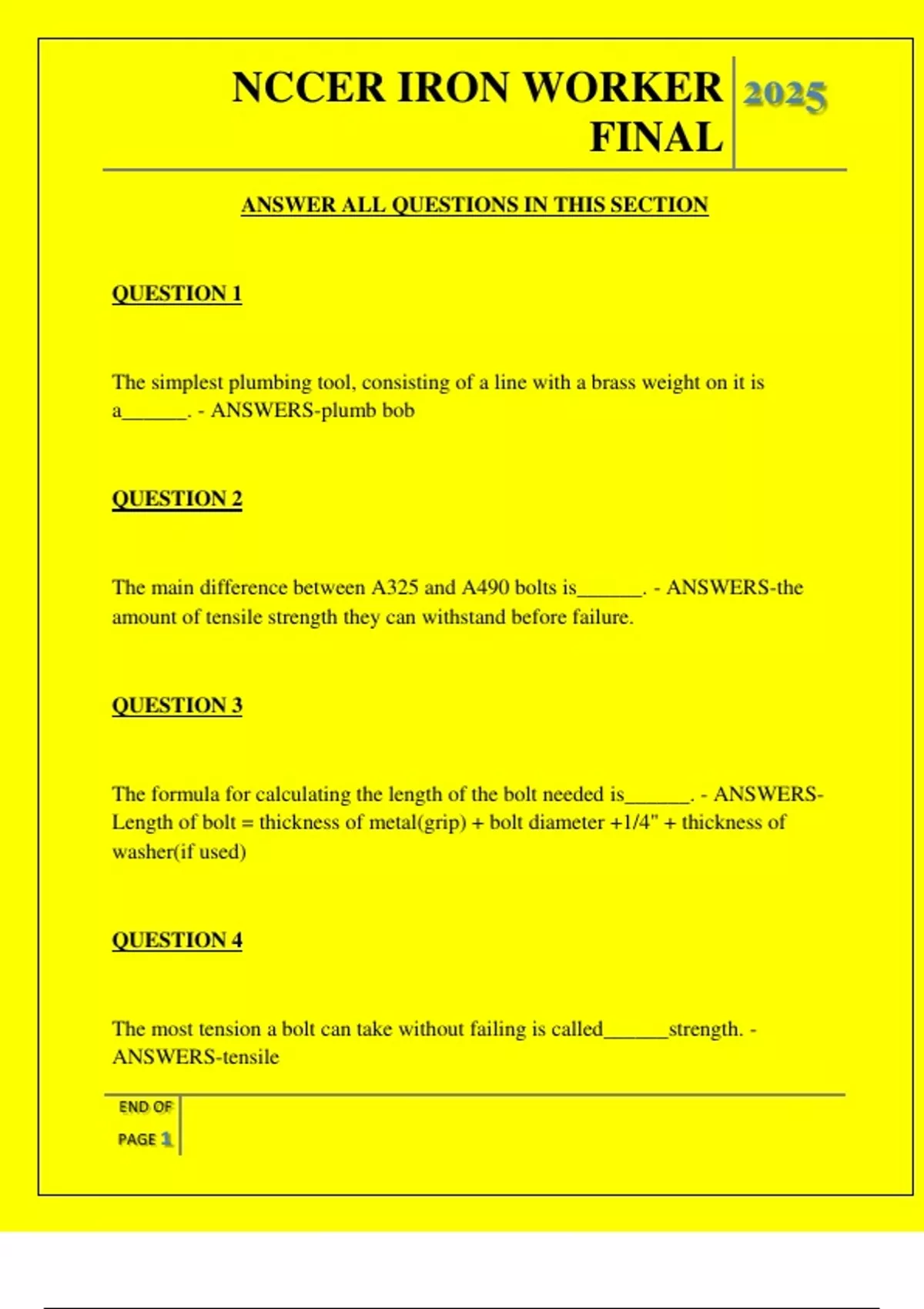 NCCER IRON WORKER FINAL QUESTIONS AND ANSWERS 2025