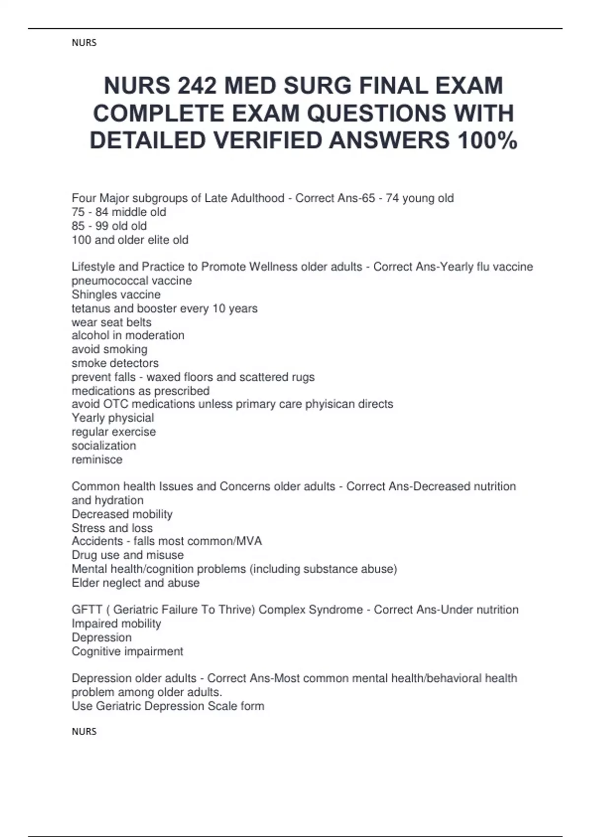 Four Major subgroups of Late Adulthood - Correct Ans-65 - 74 young old