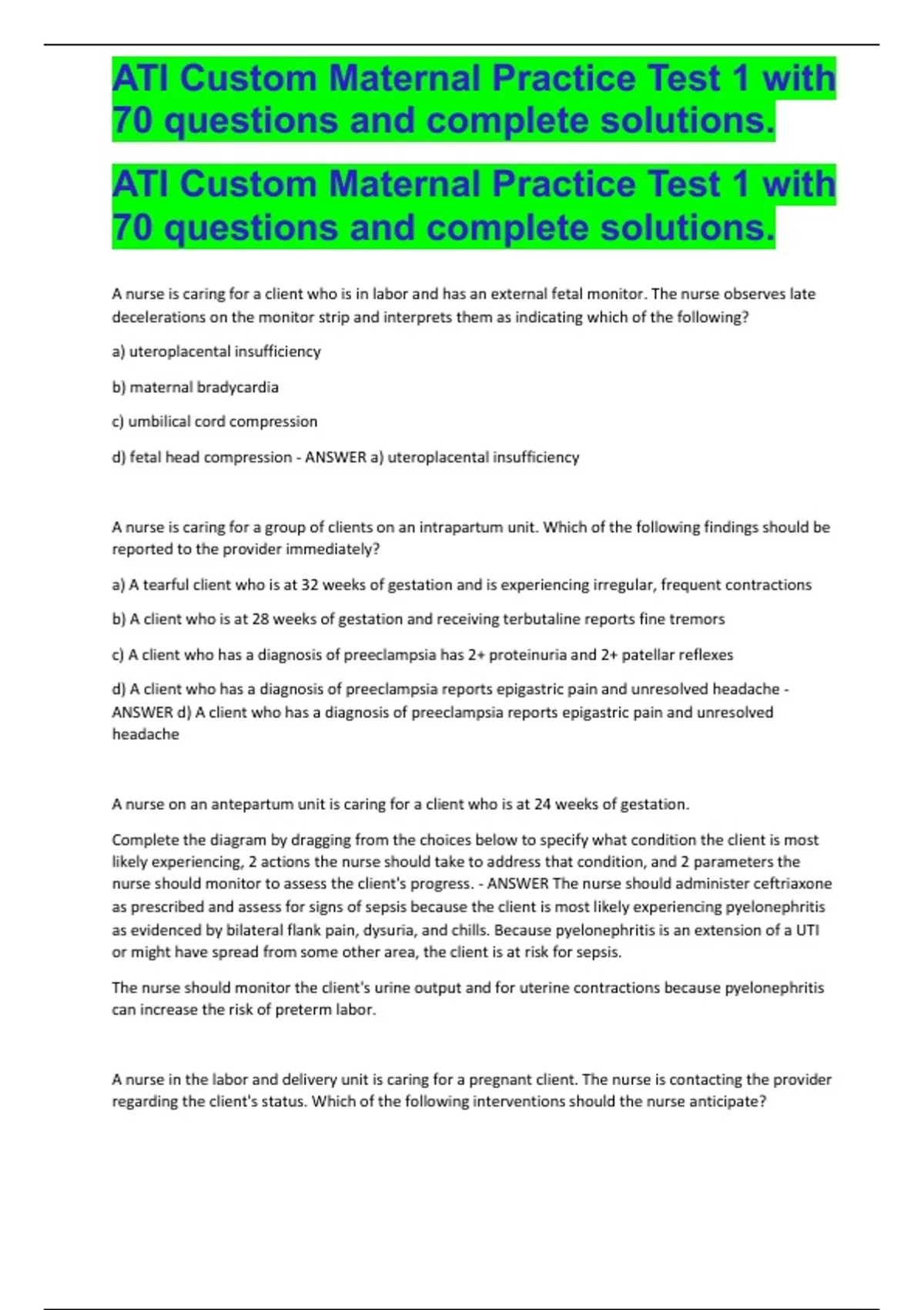 ,ATI Custom Maternal Practice Test 1 with