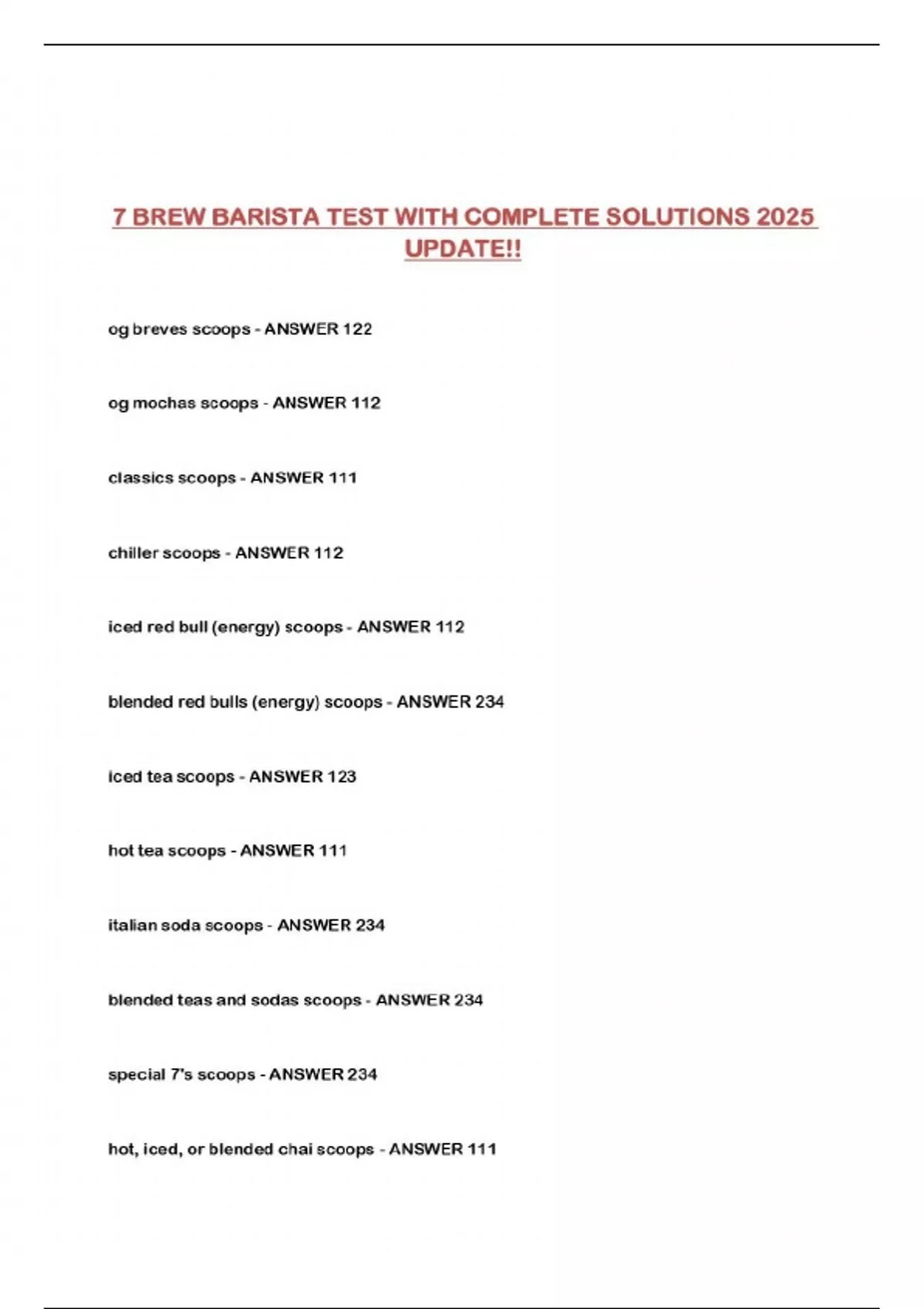 7 BREW BARISTA TEST WITH COMPLETE SOLUTIONS 2025 UPDATE!!...