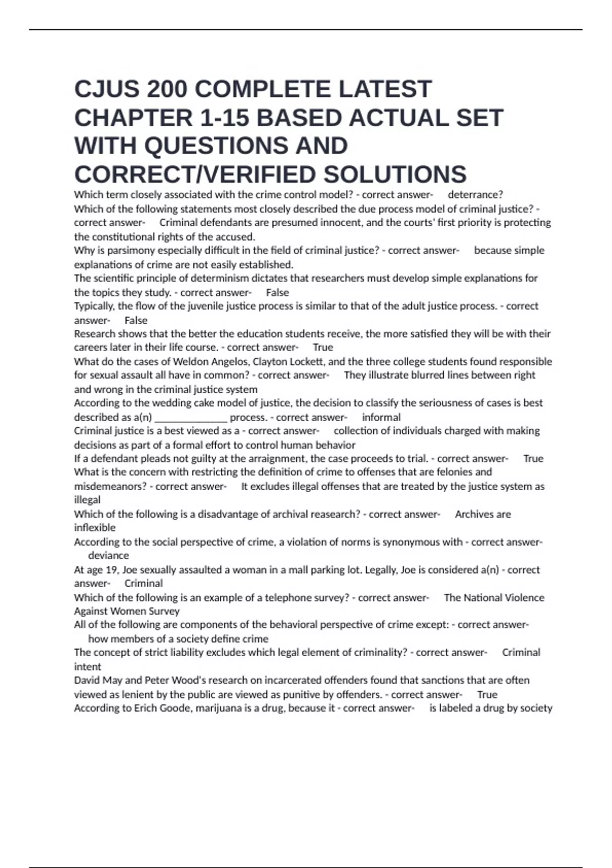 CJUS 200 COMPLETE LATEST CHAPTER 1-15 BASED ACTUAL SET WITH QUESTIONS AND CORRECT/VERIFIED SOLUTIONS